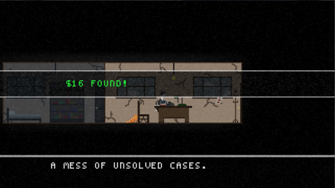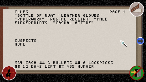 Every round of the game is randomly generated and last only a few minutes. You travel to a variety of areas in the town via map selection, then look through for clues and supplies, while gathering possible suspects from residents. Areas are also marked if they have had an event recently, like a murder or a takeover by another faction. You have to use your best judgment to stay hot on the trail, but remember that your time is limited. Your detective hungers, so you need to buy food with spare change you find in different areas, or you will end up dead before the killer is found.