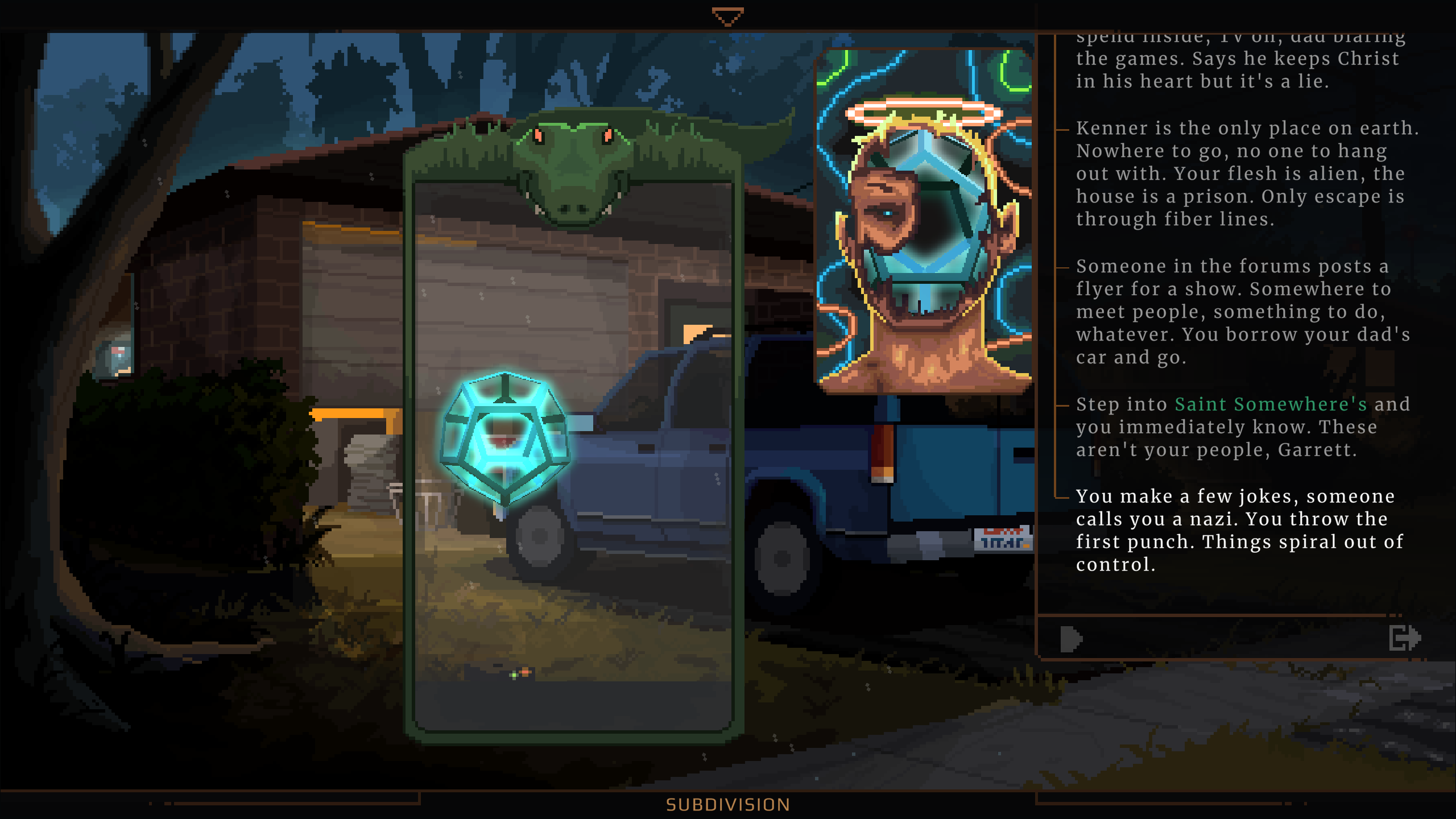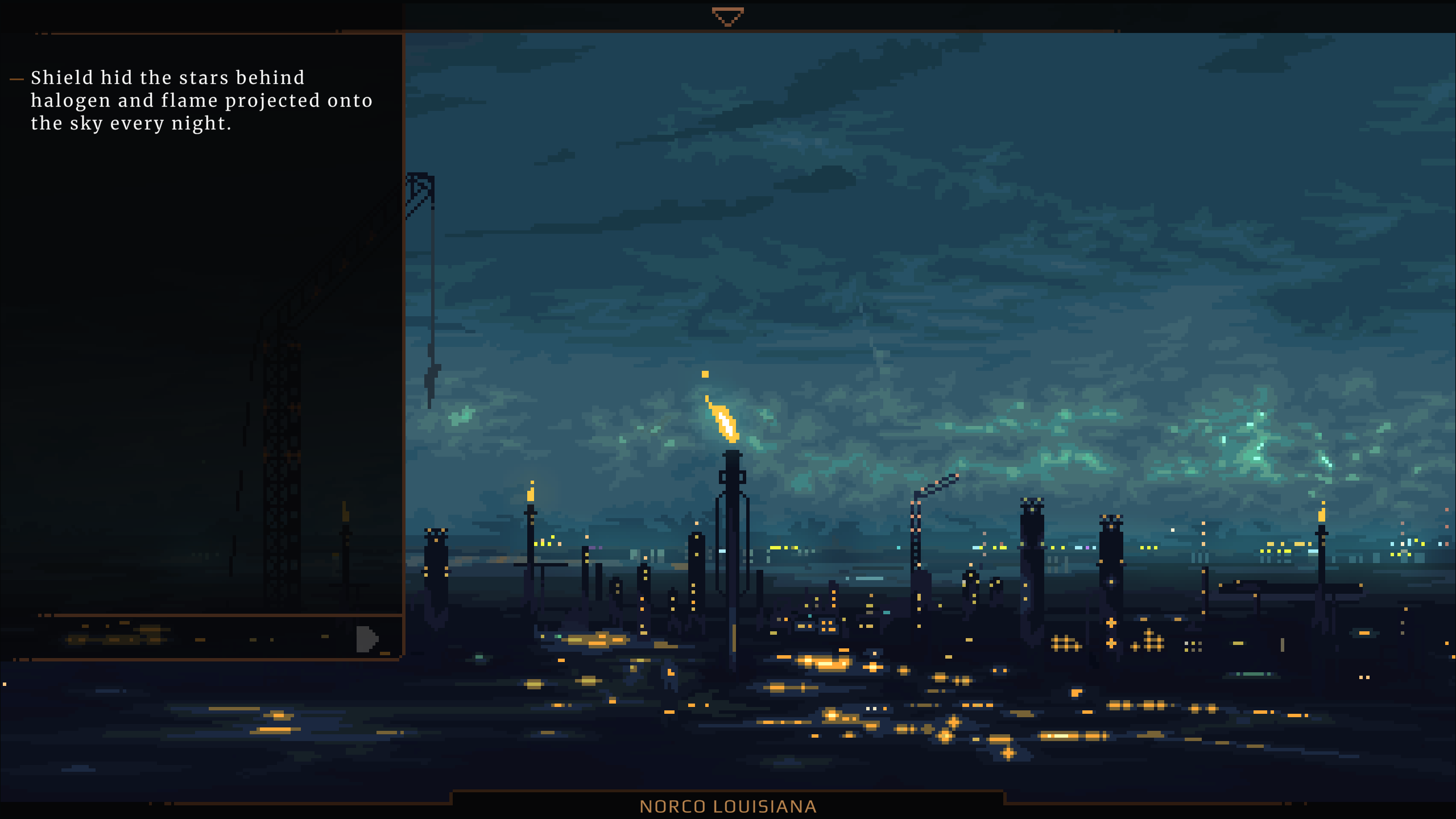 Yuts was an artist who was doing a project with some fellow creatives on a unique place in Louisiana called Norco, a “census designated place” basically under the thumb of the Shell Oil Corporation that literally stands for “New Orleans Refining Company.” The project was meant to be a sort of multimedia documentary, using real stories with an unorthodox style of presentation and even media. This included making sprite art that they shared on tumblr, and got so much feedback about wanting to play the game this sprite art existed in that they decided to, you know, make this a game project and fund it via patreon backers. It may even be a full trilogy, though that seems up in the air.