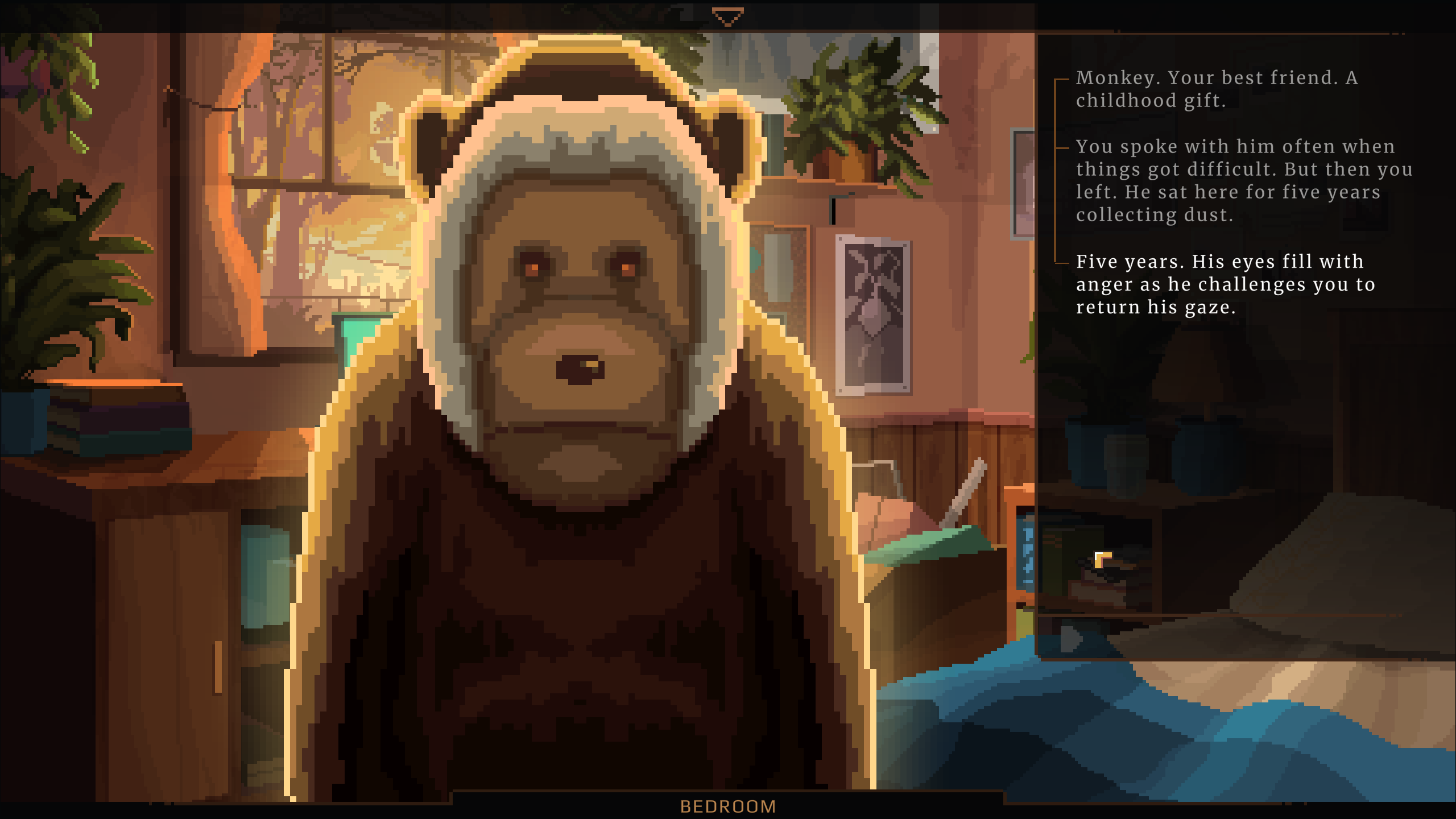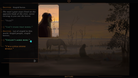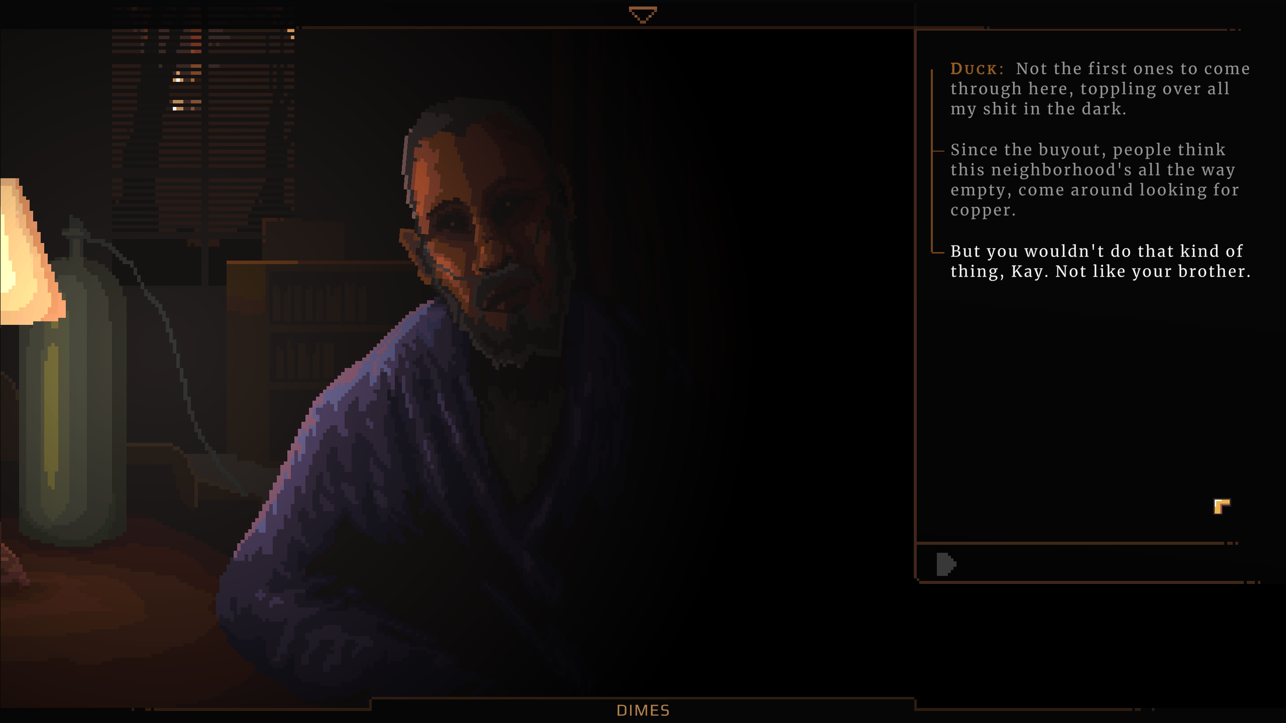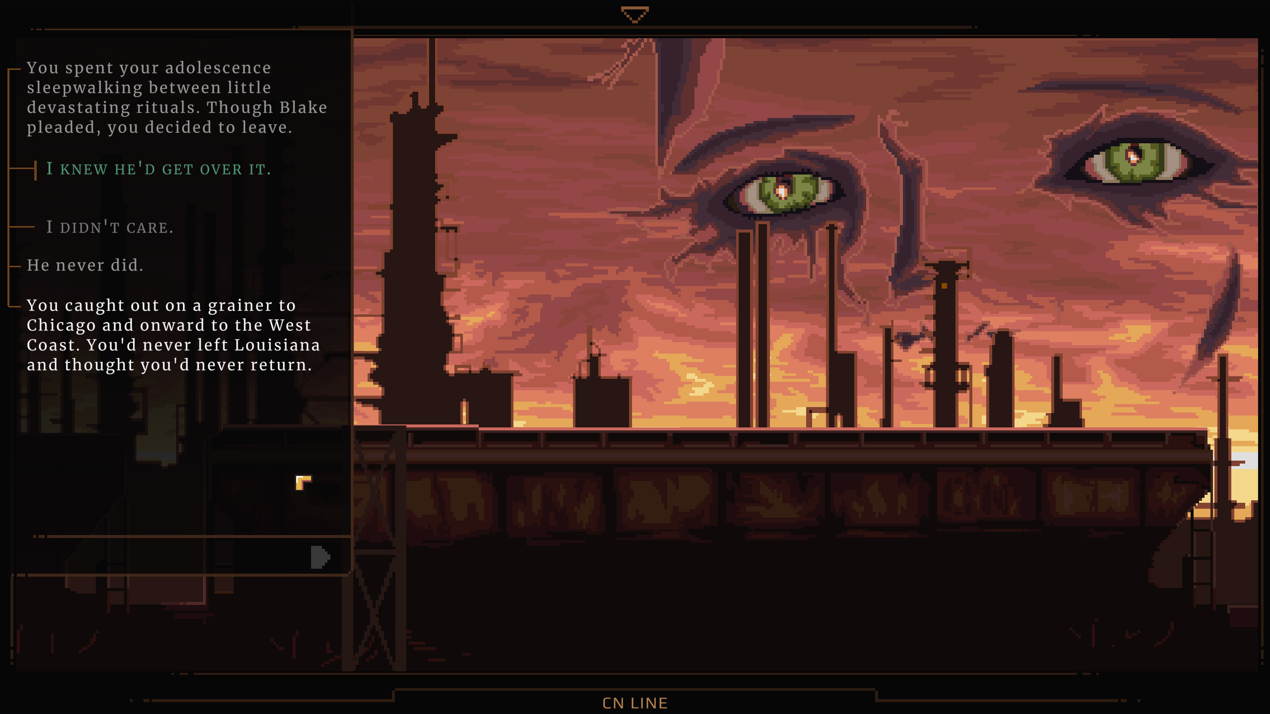 About the closest contemporary NORCO has is Disco Elysium in terms of writing, tone, and its artistic goals. Bitterly melancholic over political reality, ethereal and beautiful in looking at the suffocating normalized decay of the world around them, and just extremely funny almost constantly. Every tone and idea blends together almost naturally, the contrast between the more wild ideas and the lived in recreations of real people and places actually making both equally believable. The amazing sprite work and beautiful music and prose sews everything together into a single, almost memorizing experience, the spell breaking only for much needed comedic breaks between the drama and emotional turmoil.