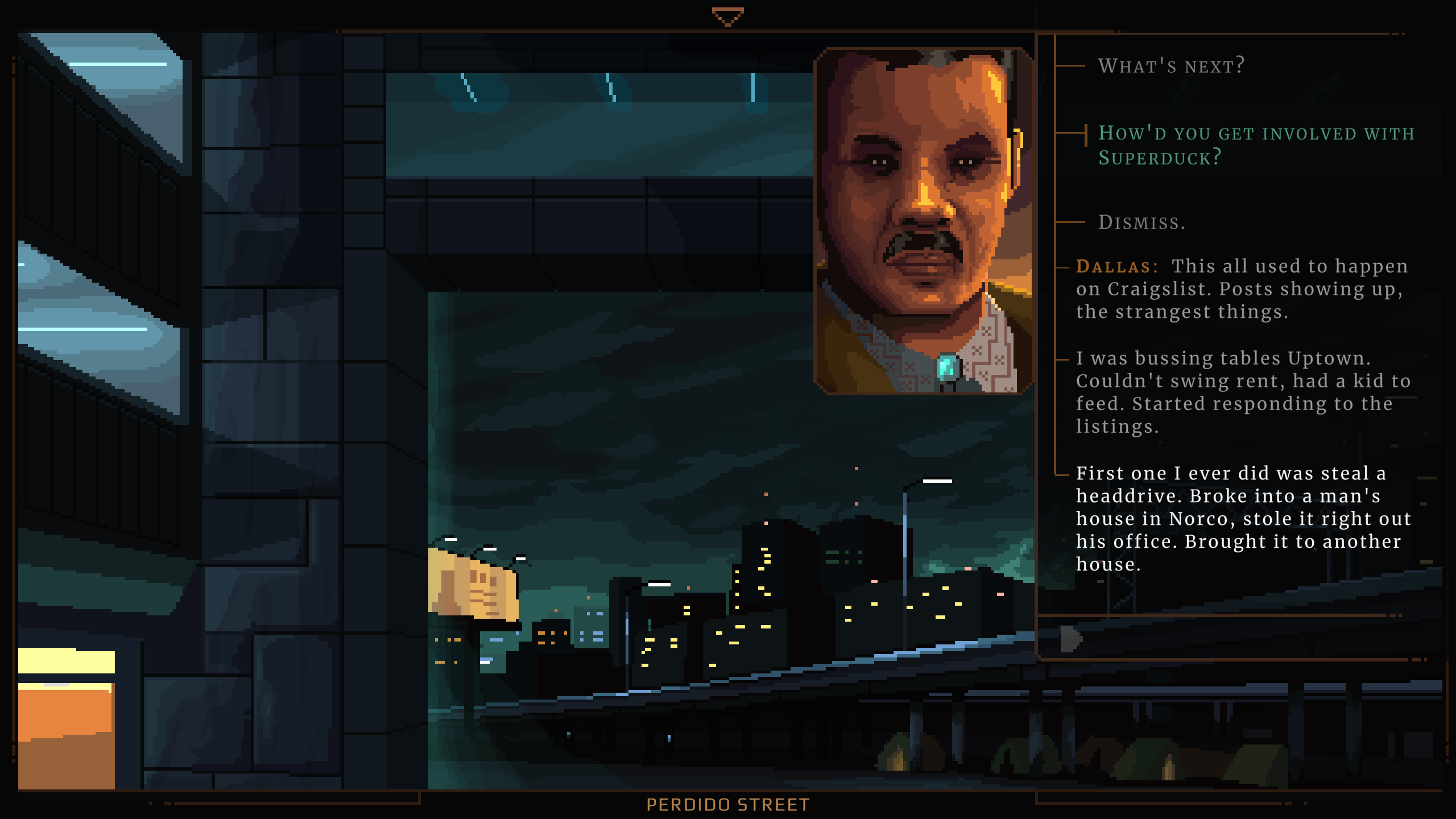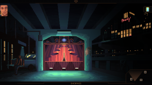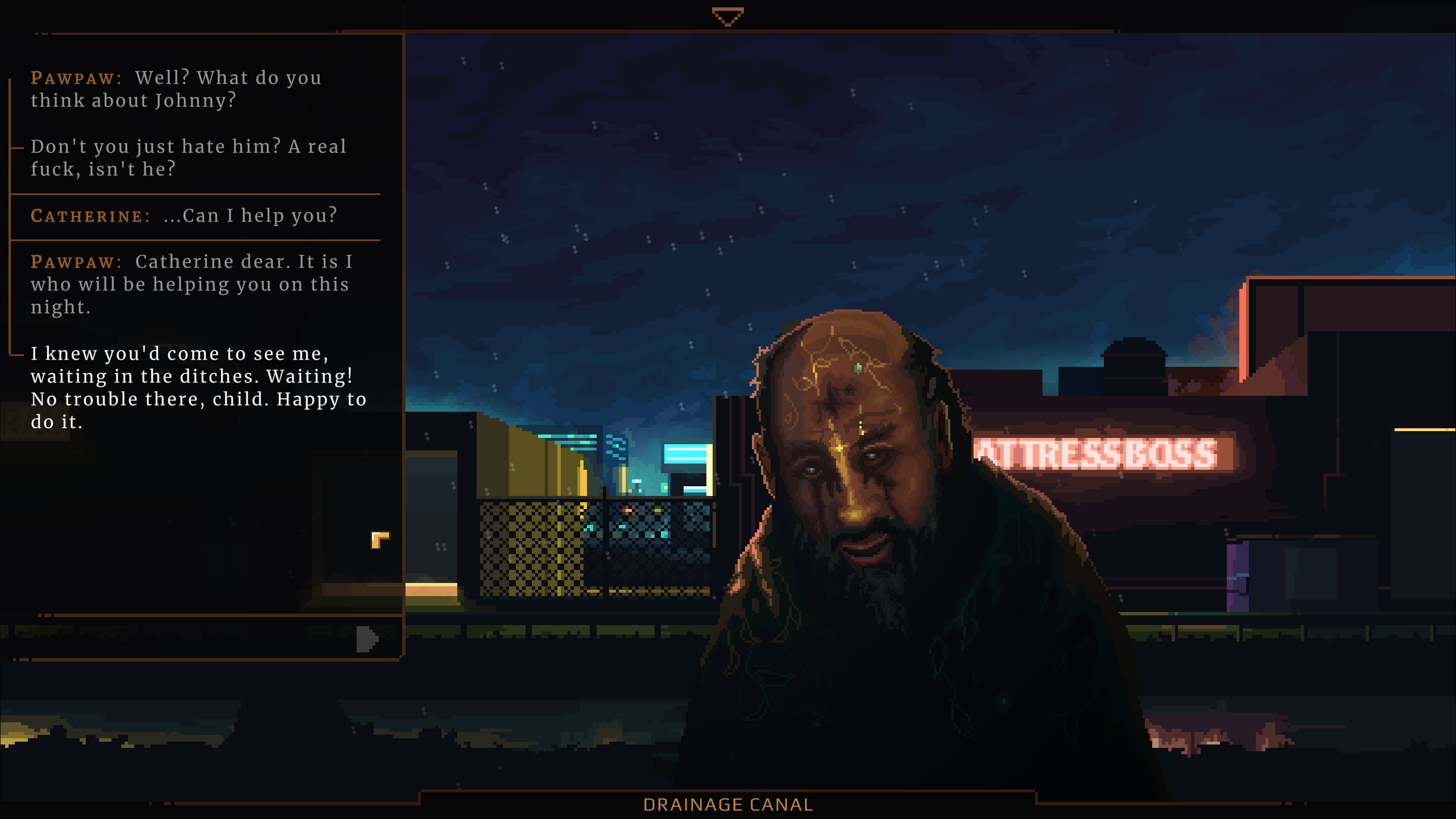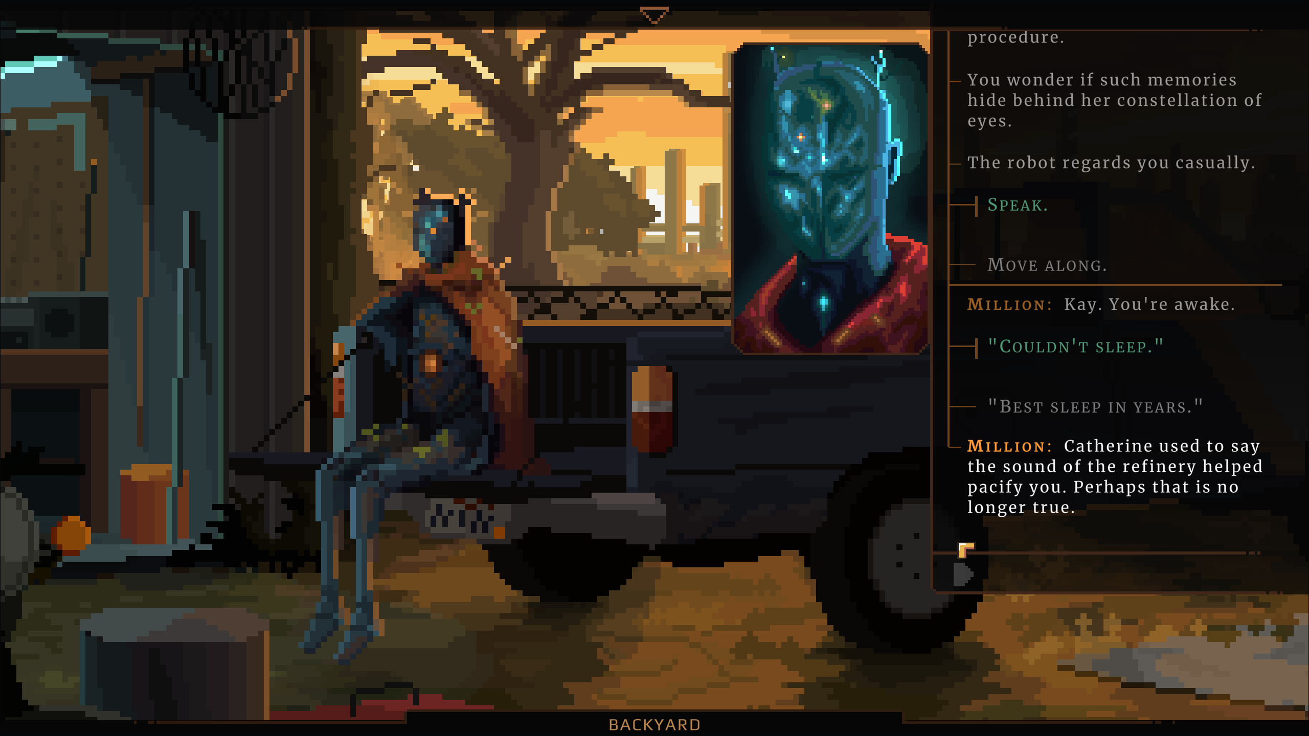 Actually playing the game is a different experience entirely, even if the writing has a similar sort of feel and use of tone swerves. NORCO is a fairly concise narrative that uses elements of point and clicks, RPGs, and visual novels, lasting a solid eight hours or so and having replay value in getting any achievements you miss and their attached goofy events. Progress is fairly simple, based around exploring a variety of screens as you go from place to place, gathering information you can track in your mind map, talking to people, and figuring out solutions to problems as you come across them. Just eavesdropping on some people can lead to surprises, from moody ruination on the world to bizarre comedy bits.