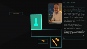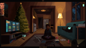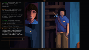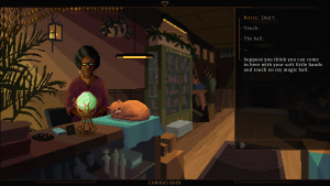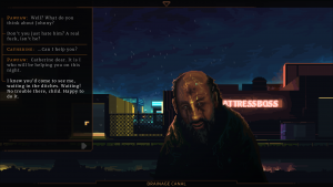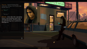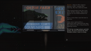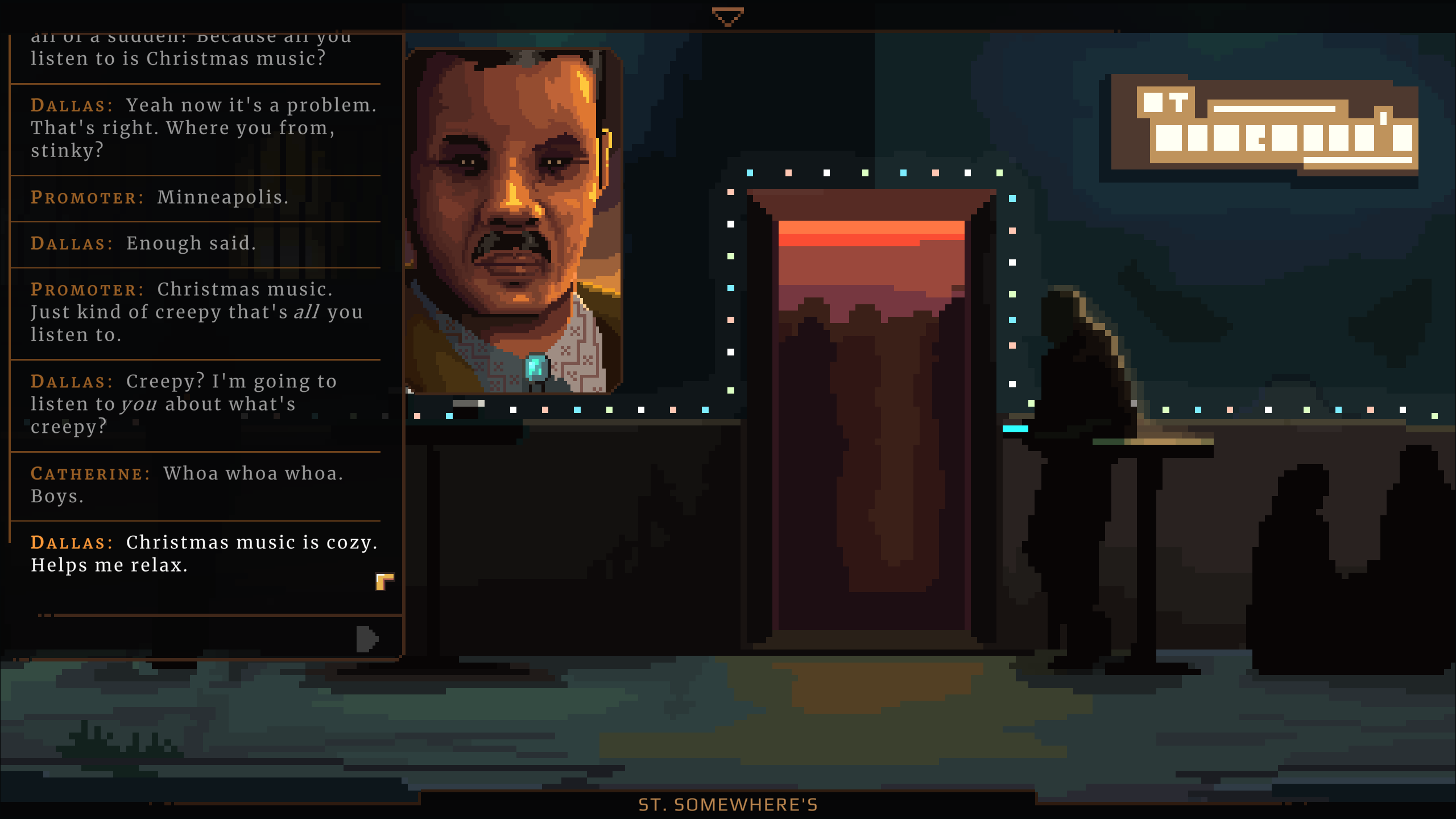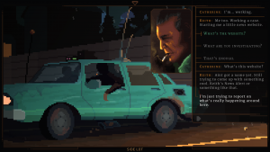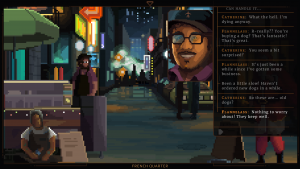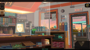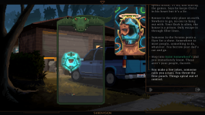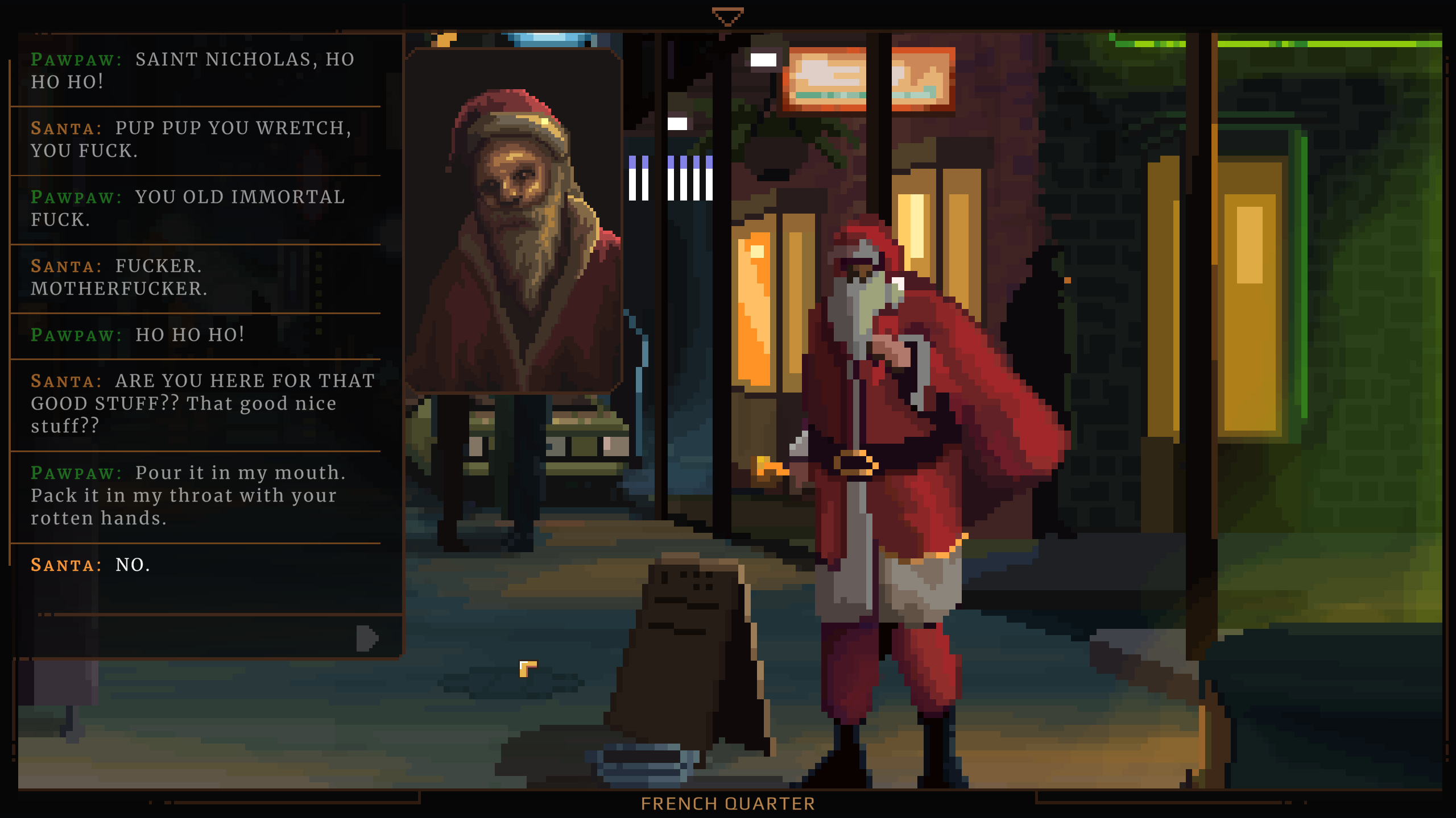 That sounds simple, but a few minutes into the game makes it clear there’s a lot more to this. Along with Kay’s family having an android roommate, there’s lot of strangeness revolving around memory preservation, unexplained swamp sightings, and a possible religious event occurring in the town. This is all alongside the more mundane oddities of modern living, like a drug selling Santa who stabs people (every dollar belongs to him), or that cult of dudes dressed in mall uniforms who want to blast off into space with a rocket.