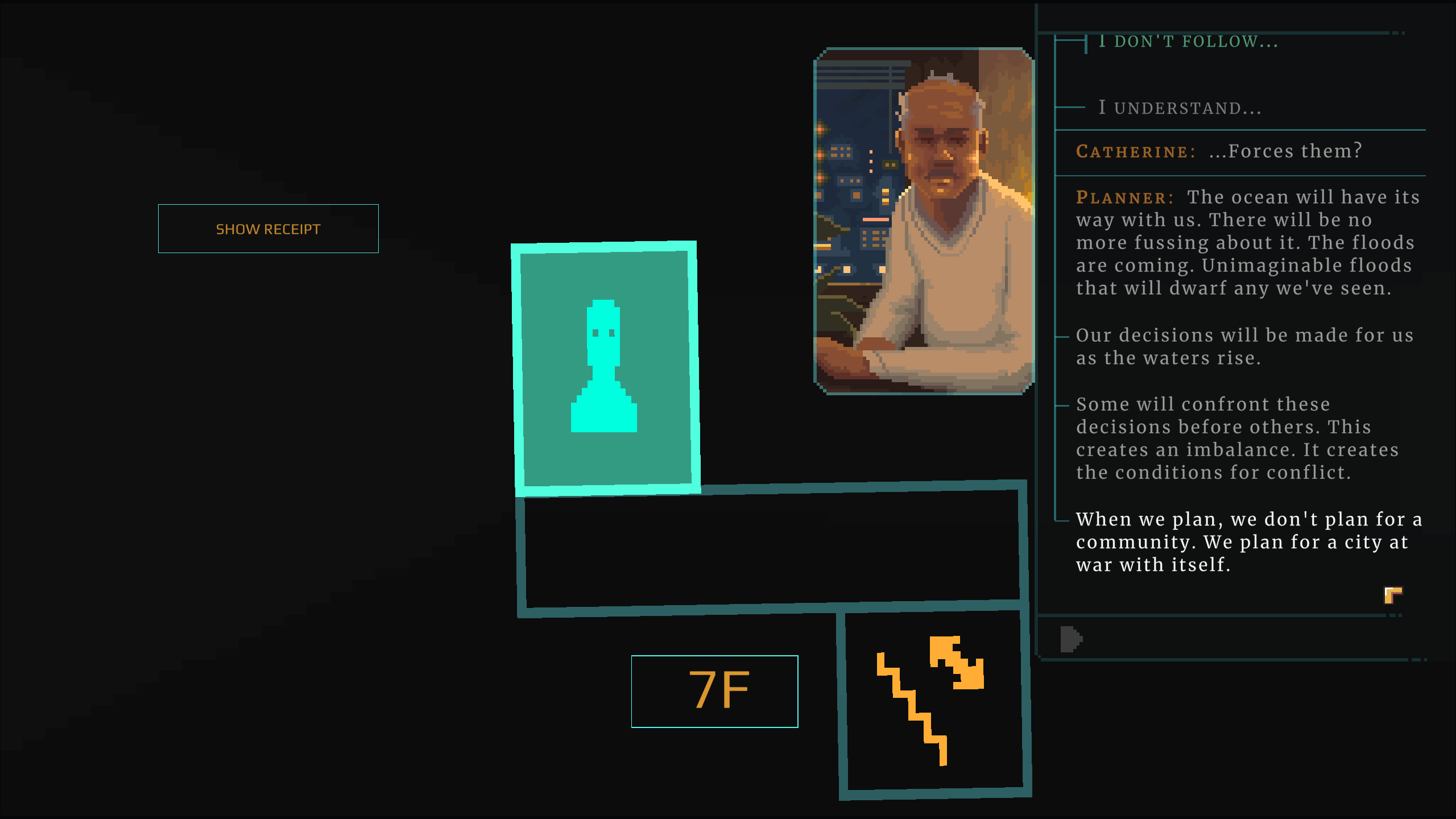 The game is simply confident. It is confident in the out there ideas it throws at you alongside details taken directly from reality. A major plot point relating to a refinery explosion is based on a real one at a Shell refinery in the area’s history, and the mother’s friend, Duck, is based on an actual resident named Stacey Ryan. Like Duck, he was a final holdout on a real estate buy out, with a full documentary made about his story. Even the more outlandish ideas have some clear real world connection, like an app that pays in cryptocurrency (the outlandish part is when you find the one that runs the app), or that cult we mentioned having some similarities with the following of Elon Musk and similar tech grifters that promise the stars instead of actually doing anything for the world we live on.