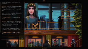 It is an interesting mix of outsider artists doing something unique, but still with some solid understanding of game design. Chapters are well divided and knowing what to do is always clear. There are a variety of angles in the case to look into at any time. Party members come and go in natural ways that blend well with the story focus, and often have surprising facets to them that can come into play with how the chapter progresses. You’re often rewarded for experimenting with phone apps in puzzles, usually in more goofs. This is a proper game, just one that knows when to bow out, a rather rare trait these days.