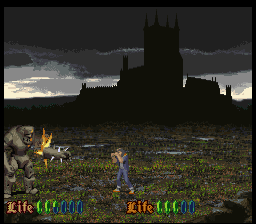 Before completing any of the six castles, the player is challenged to a boss fight, which usually takes place in outdoor areas. Some of these are rather genre typical, like a hunchback who turns into a werewolf in mid-battle, or a staggering, clingy zombie, but then Kyle has to fight off a pair of apes in loincloths, an angry cloud of fog and a rock golem who shoots his arms as rockets, Mazinger Z style. During those showdowns, the issues with the hit detection become even more frustrating, and some of the later bosses almost seem invincible without a portion of luck. The vampire lord at the very end almost feels like a letdown in comparison, even though he adheres to the Castlevaniatradition of coming back for revenge in a transformed state – here a giant, humanoid bat.