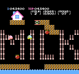 The game comprises a whopping fifty unique stages as opposed to titles from Nintendo’s own line-up of arcade ports, which feature just from three to four levels per loop – really impressive for a game stored on an NROM cartridge. Stages 3 and 8, then 13 and 18, etc. are bonus rounds where the player is able to score some more points by collecting fruit, but more importantly, obtain an extra life by reaching Yoghurt within a very strict time limit – all while being harassed by familiar looking fireballs. The quicker you get to the end of each level, the more bonus score you earn at the end of each round. Traditionally, the game loops back to the first stage upon beating all the levels. The second loop introduces two flying things – when Milk faces the right side of the screen, a yellow helicopter that can be collected for points appears, but when he faces the left side, a red blimp shows up, and you’d better not touch it! As per Nintendo’s standards at the time, the player can choose to start the game on the higher difficulty right away.