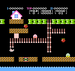 The Famicom version is vastly different, although some elements from the 8-bit computer original are still there. This time around, the game is a single-screen platformer and the characters are colored differently. Once again, Milk’s task is to collect all the fruit in the stage, while avoiding Nuts at the same time. Then the player has to reach the house in the upper left corner, where Milk’s fiancée, Yoghurt, is waiting. This makes the game even more similar to Lode Runner, ported to Famicom by Hudson themselves just a few days later. It also ditches the computer version’s blue and grey color scheme for a black one, similar to other Famicom games.