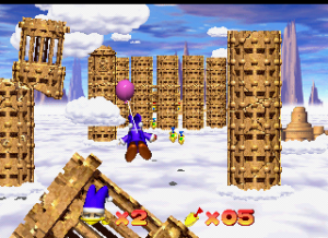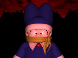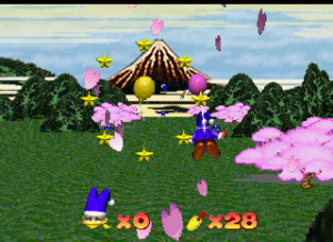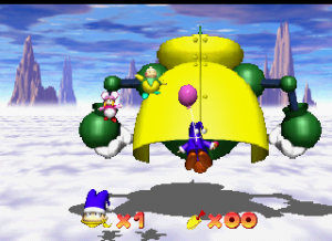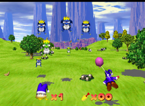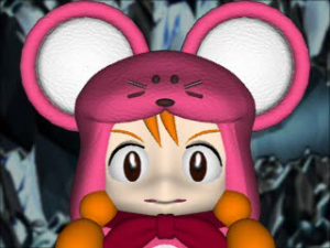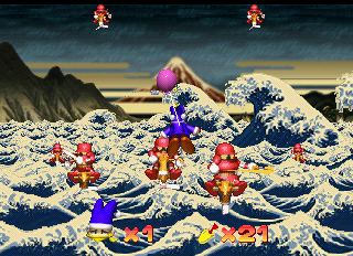 This game could almost be classified as a rail shooter, except there’s no real shooting. Taking place from an over-the-shoulder perspective, the environments scroll by 3D while the characters and certain parts of the scenery are sprites, animated with scaling effects a la Space Harrier. Gikugiku wields a wand, which can be used to smack anything that comes near. When you pick up one of the many floating bookmarks, you can also charge up the wand to reflect objects away from you, potentially hitting other enemies, or get a small burst of speed to help dodge attacks.