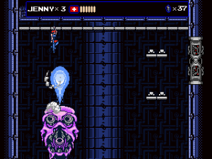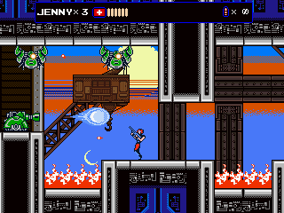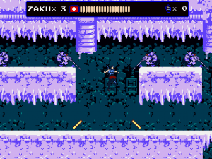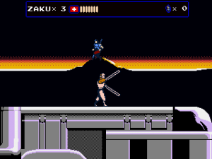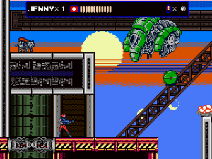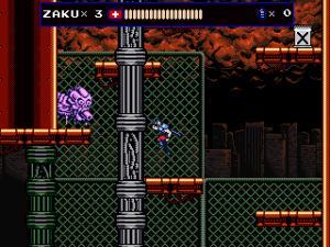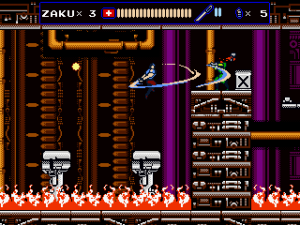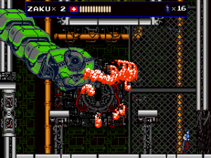 The most significant addition, however, was the new stage 7, which follows Jenny in her hostage rescue mission. This episode plays a lot like Contra, as Jenny fights with a gun which can be fired in all eight directions and repurposed as a grenade launcher. There are also Mega Man inspired elements, like the famous vanishing platforms. Her stage is pretty long – the third and last segment almost too long – and contains three boss fights against a giant metal skull. Unfortunately there is no special reward for clearing it, not even a new cutscene. If the game wasn’t hard enough already, the Steam version also adds a hardcore mode, which starts Zaku with a single life, does not replenish health at the beginning of sub-stages and can only be played in one sitting.