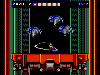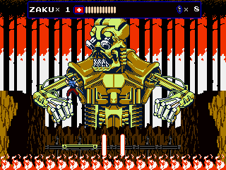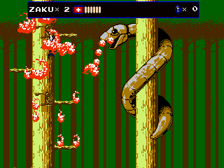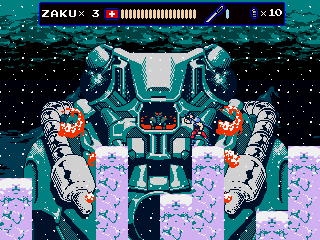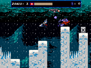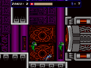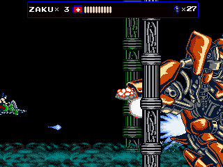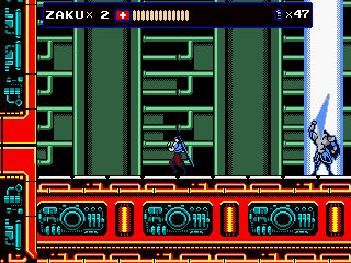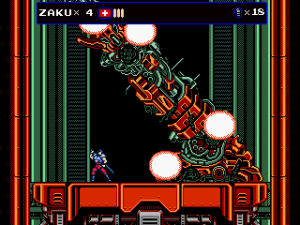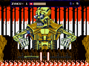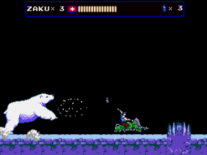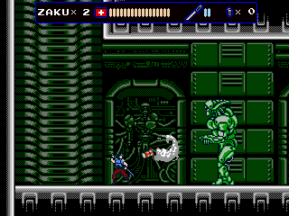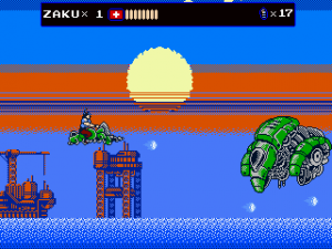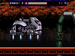 Every once in a while, Zaku gets on a hoverbike for fast-paced autoscrolling shooter stages, which nonetheless still put a lot of focus on jumping over obstacles. When on the bike, grenades are thrown backwards to give a means to attack enemies that approach from behind, but it takes time to get accustomed to. Especially later in the game it is often required to fire away while jumping, which can get very straining on the hands, even more so when playing with a keyboard. They’re not the most difficult stages in the game, but certainly among the most annoying. At least the bike accounts for an exciting chase scene with a cyborg polar bear, can’t say you see that every other day.