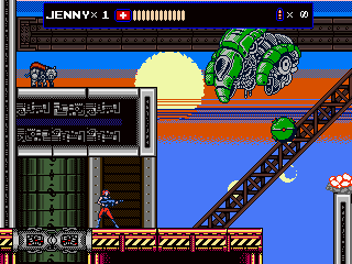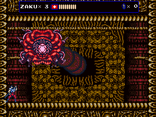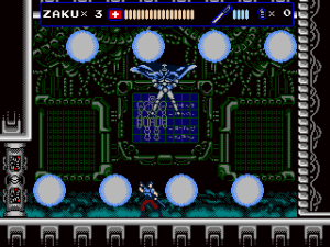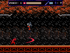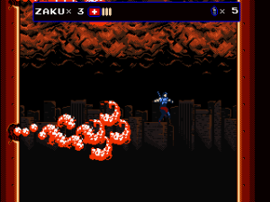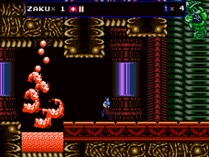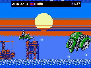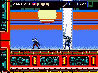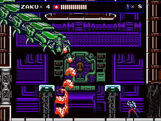 But Oniken also reveals the ugly face of old school difficulty. There are no respawn points before bosses, making it impossible to focus on practicing them. This gets especially frustrating with later bosses, who can kill Zaku instantly by pushing him down a pit. Yes, the “recoil” stun that accounted for thousands of deaths in Castlevania and Ninja Gaiden is back to wreak havoc on your nerves. Thus one often ends up repeating sections that have long become routine dozens of times, just to get back to the really hard parts again. The biggest blunder are the randomized item drops, though. Getting enough sword upgrades for invincibility right before the boss can render an originally excruciatingly hard fight pointlessly easy.