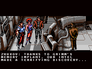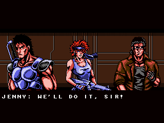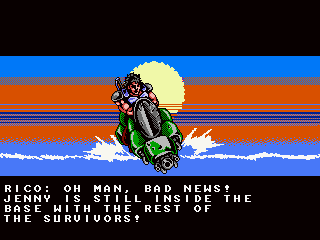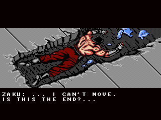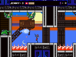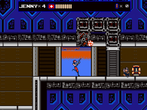 It is the year 20XX (of course), and the modern super ninja mercenary Zaku is hired by the military to take out the “Oniken,” a terrorist ring that is about to take over the world. (Oddly, their leader is not Japanese at all, making one wonder why the organization is named Japanese for “Demon Sword”, but this is not the time for heavy thoughts.) Supported by the two sidekicks Jenny and Rico – who, like Ninja Gaiden‘s Irene and Robert only show up in the story, but never in the actual game action – Zaku takes on the Oniken gang, with their army of cyborgs and rogue ninjas, but is saving the world his only motive? Oniken tells its simple story in cinematic cutscenes of the kind many know from Ninja Gaiden, but their pacing and style is actually more similar to Vice: Project Doom. Just as in those classics, dynamics are created through cuts, the shifting around of sprites and palette rotations, “actual” animation is barely existent. If you want to cut right to the action, they are all skippable; not so the handful of in-engine cutscenes, though.