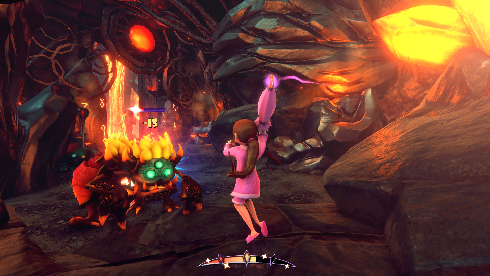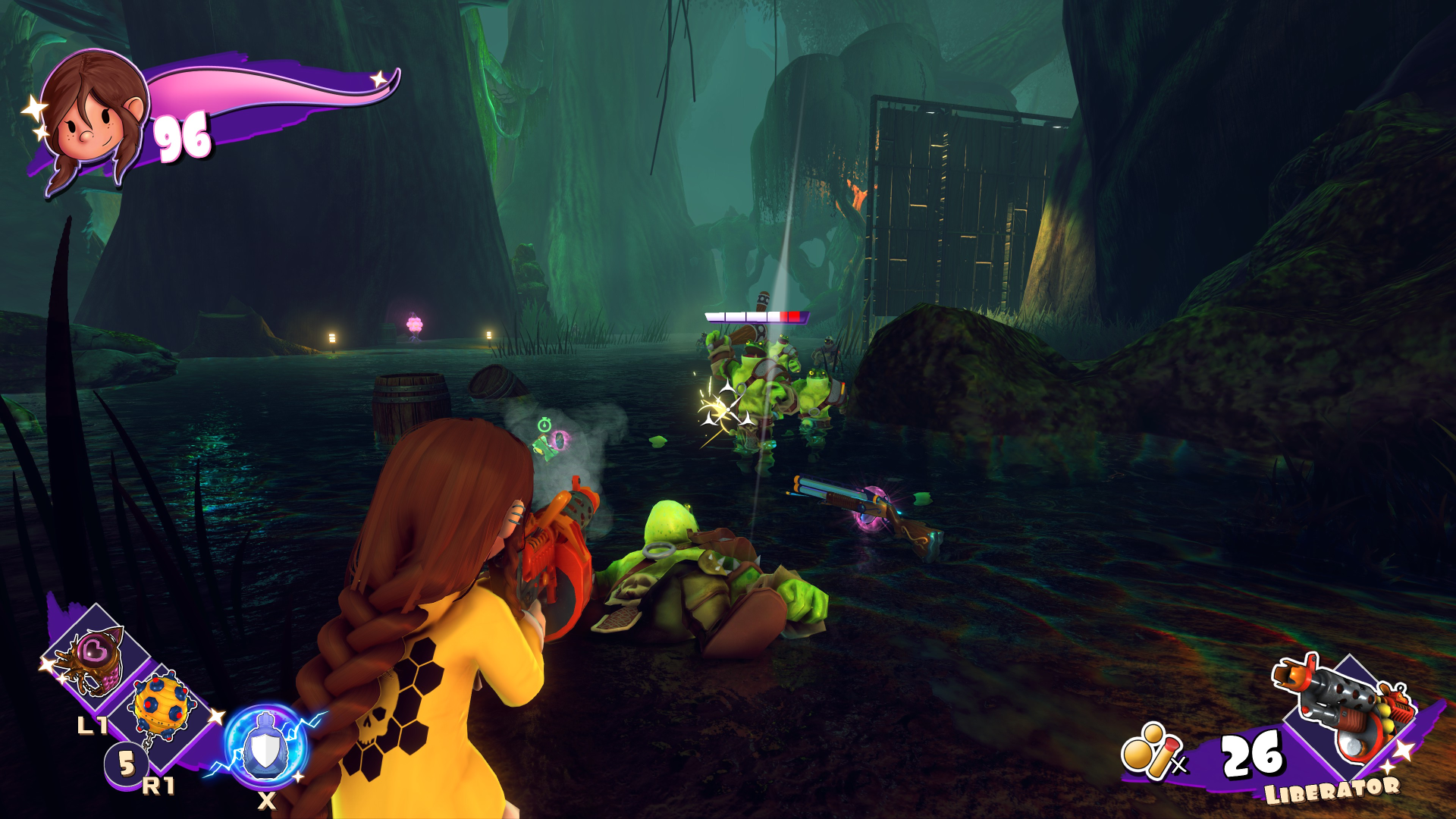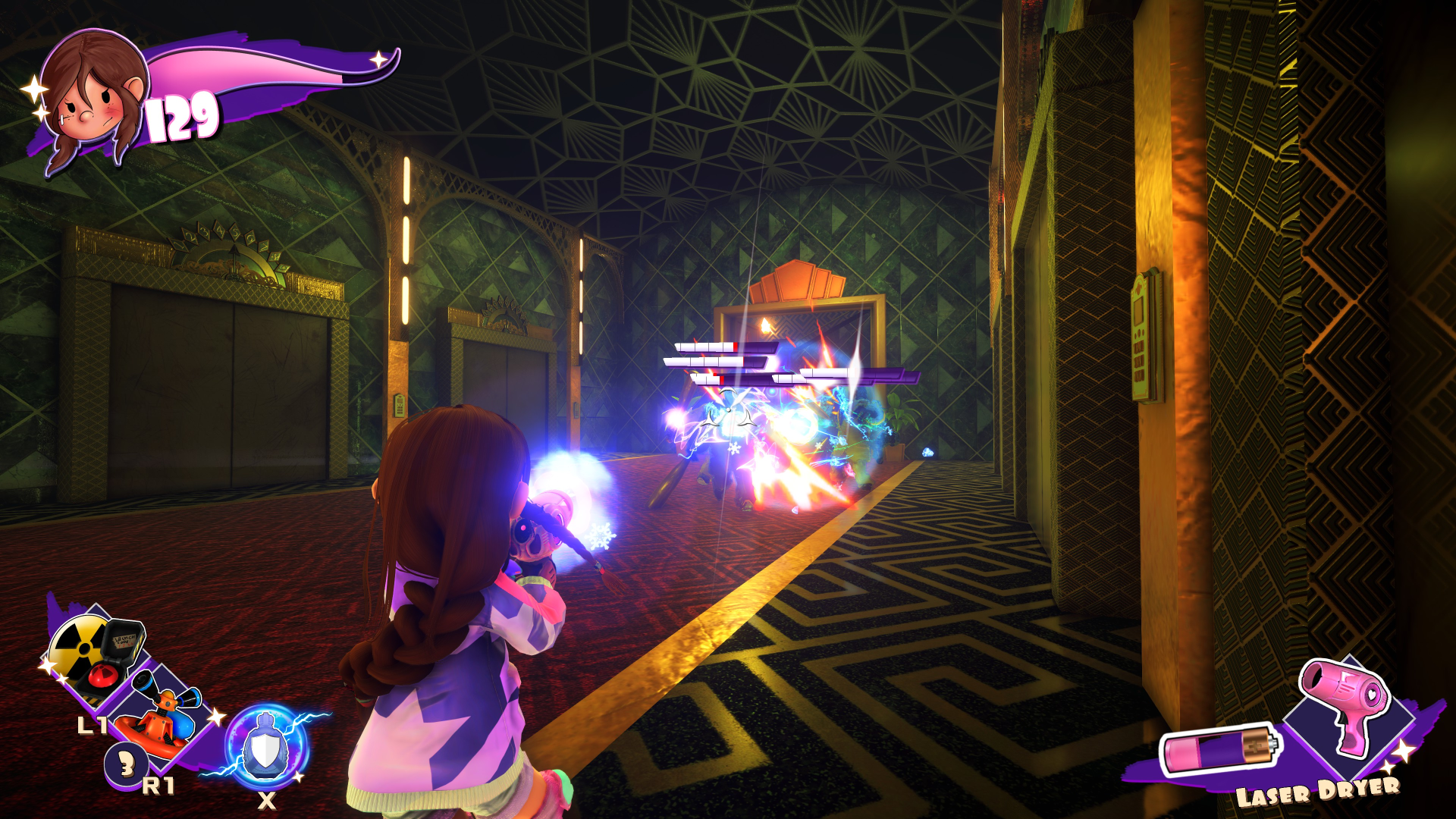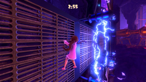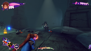 Her childishness extends to her one-liners. Her taunts to enemies are things like, “One, two, three, you’ll be sorry!” and “I didn’t meeean to hurt you! Just kidding!” Getting new weapons yields dialog such as “Give me a meanie to test this on!” And even getting hurt gets stuff like “Stop it! I’ll tell!”
