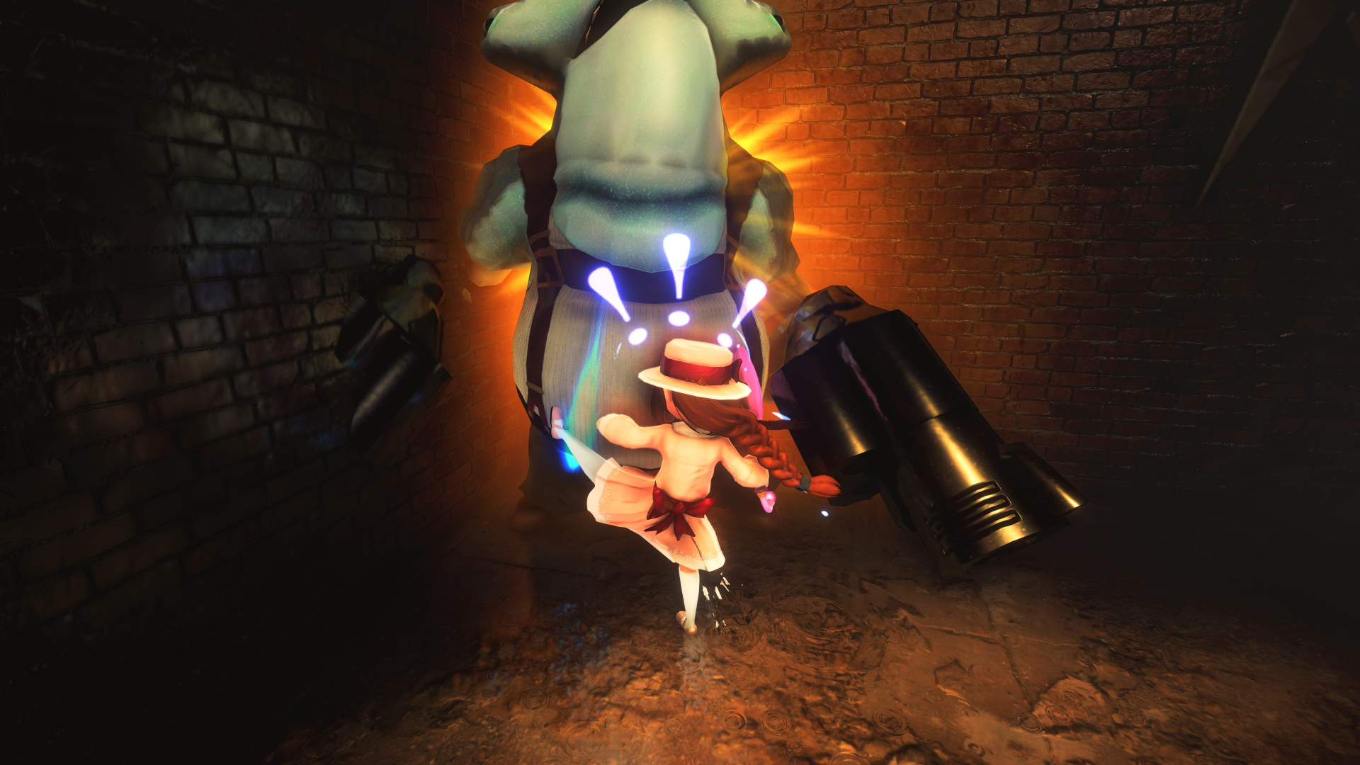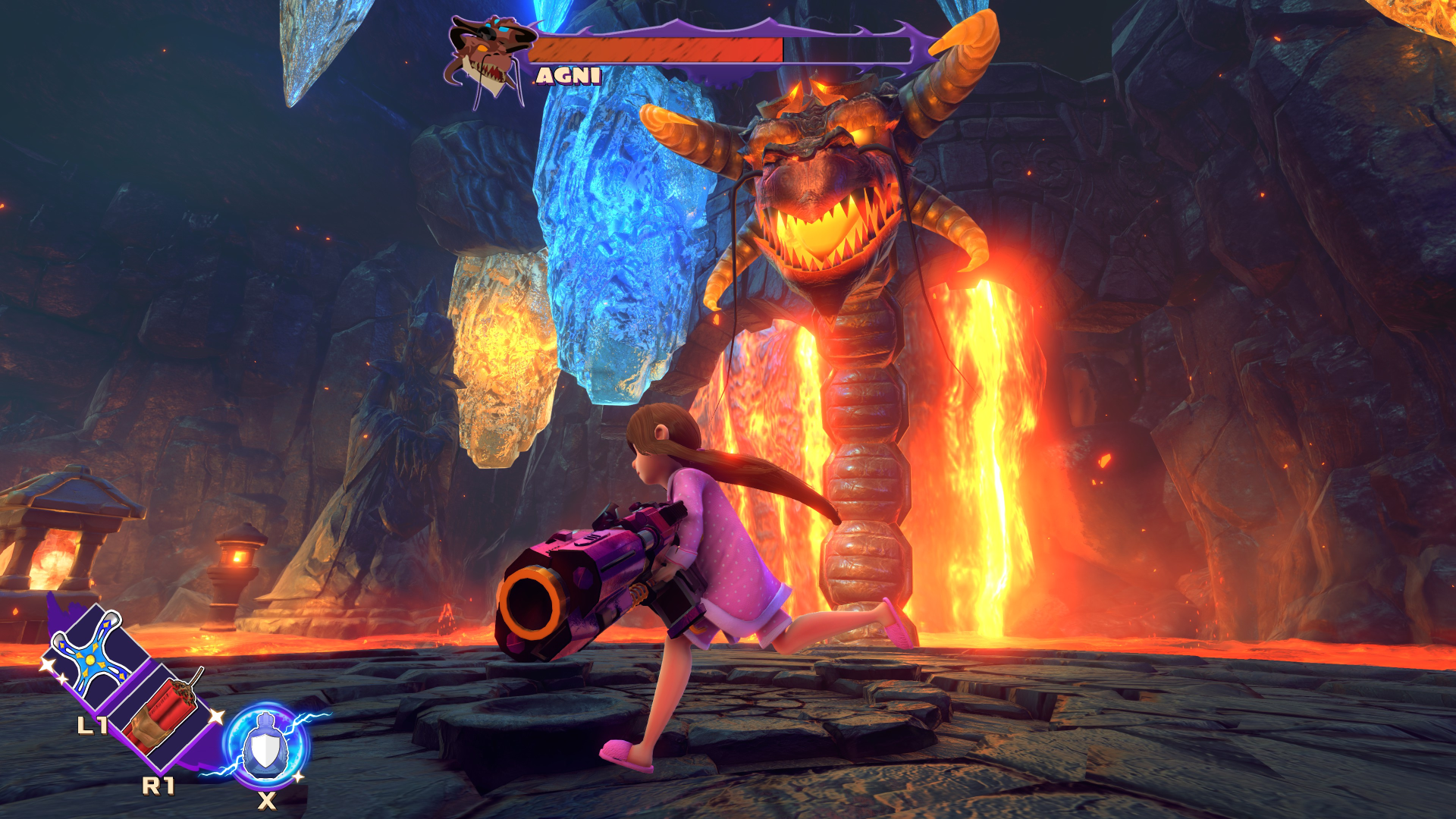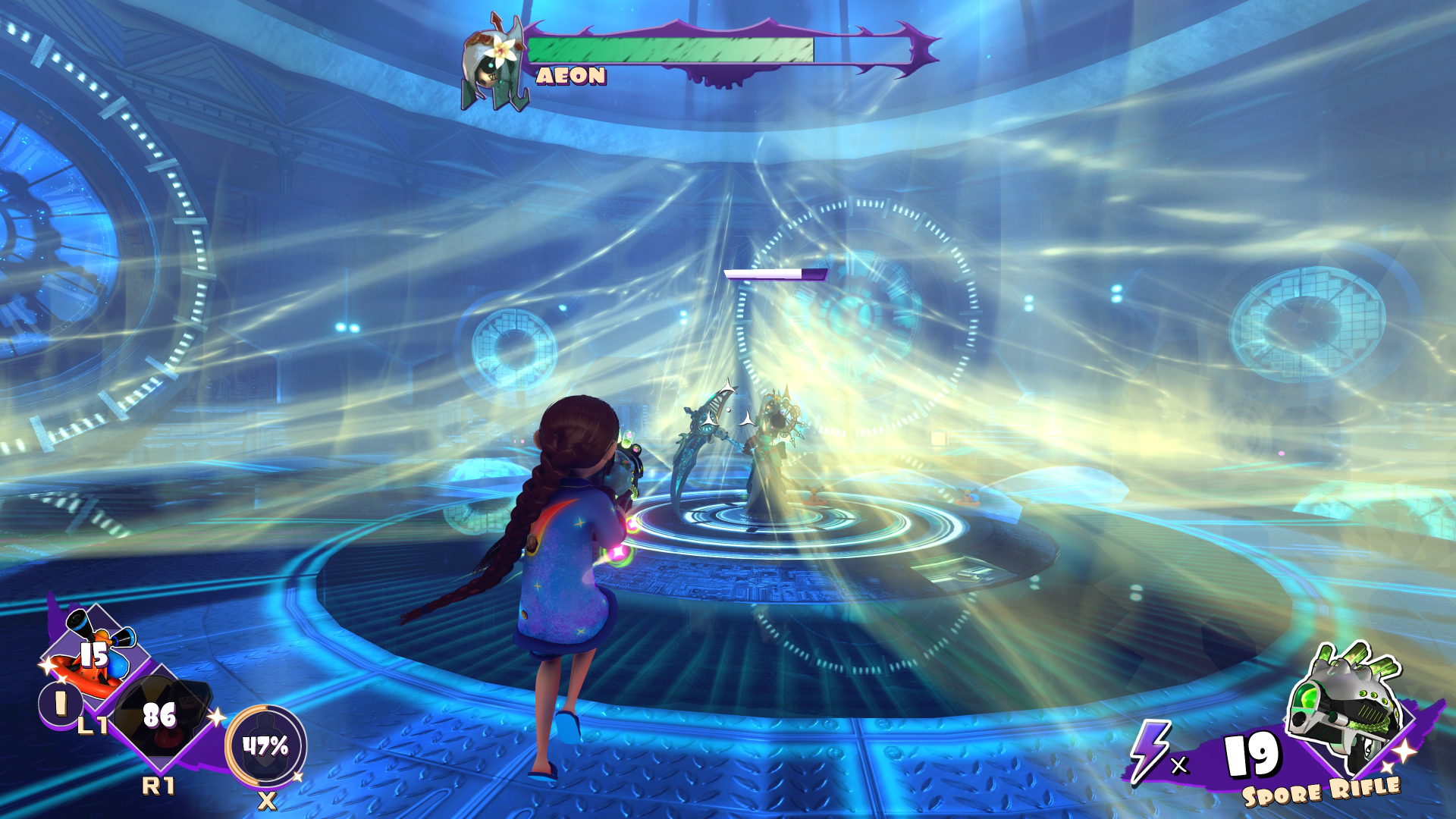 Her childishness extends to her one-liners. Her taunts to enemies are things like, “One, two, three, you’ll be sorry!” and “I didn’t meeean to hurt you! Just kidding!” Getting new weapons yields dialog such as “Give me a meanie to test this on!” And even getting hurt gets stuff like “Stop it! I’ll tell!”