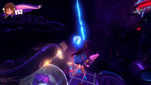 The story gets more complex and full of surprises as you progress further through the game, and even encounter things such as an alternate nightmare world full of viscera, teeth, eyeballs and endlessly spawning twisted enemies, which slowly drains your health as you stay in it. Even the bad guys are horrified by you messing with the portals that take you there. You can get your health back by entering globes of light emitted by plush toys, which is a Metroid Prime 2: Echoes reference.