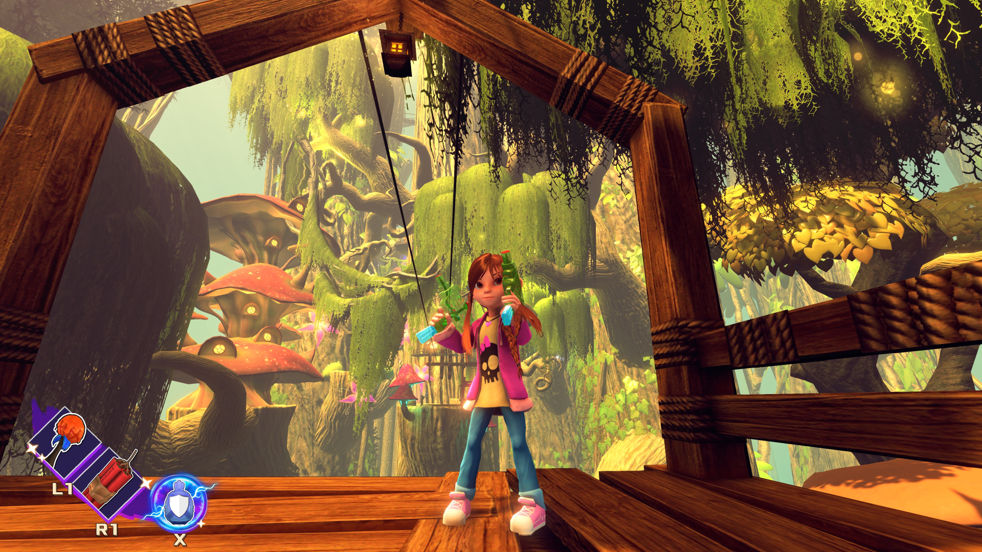 The main difference, at first, is that you push a button to switch between “shooter mode” and “platformer mode.” When in “shooter mode,” the perspective is over Carol’s shoulder (you can adjust the camera to switch to a first-person view), and pressing the attack button shoots your gun. When in “platformer mode,” the game controls more like a platformer, where pressing the attack button results in smacking enemies with your umbrella or performing combo moves such as body slams, punches and kicks.