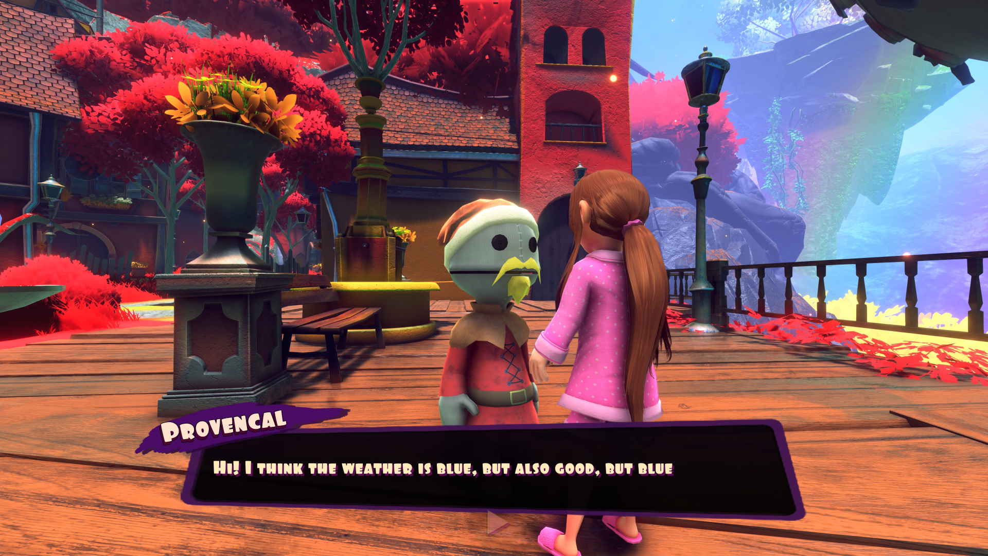 The levels themselves are tremendously varied both in theme and layout. Forests with giant mushrooms. A town of friendly crochet dolls you can talk to. A treetop town leading to a giant beehive. A land of vikings with a boat that you can use to drive to other islands. A zombie-filled manor of keys and locked doors. A 1940s-style city where mobster sharks and peaceful windup automatons both coexist. A castle in the sky sitting on giant food such as donuts and cookies, with nearby factories made of a combo of retro and sci-fi tech placed on giant floating cookies and confectionery, which happens to have a large sideways-moving elevator that leads to a citadel with inter-dimensional portals leading to a nightmarish dimension. There’s also a day/night cycle, which sometimes dramatically changes the look of these levels with very different and even some downright gorgeous color schemes for each time of day. There are even hidden bonus levels which have varied themes such as a long slide down a mountain past giant art supplies.