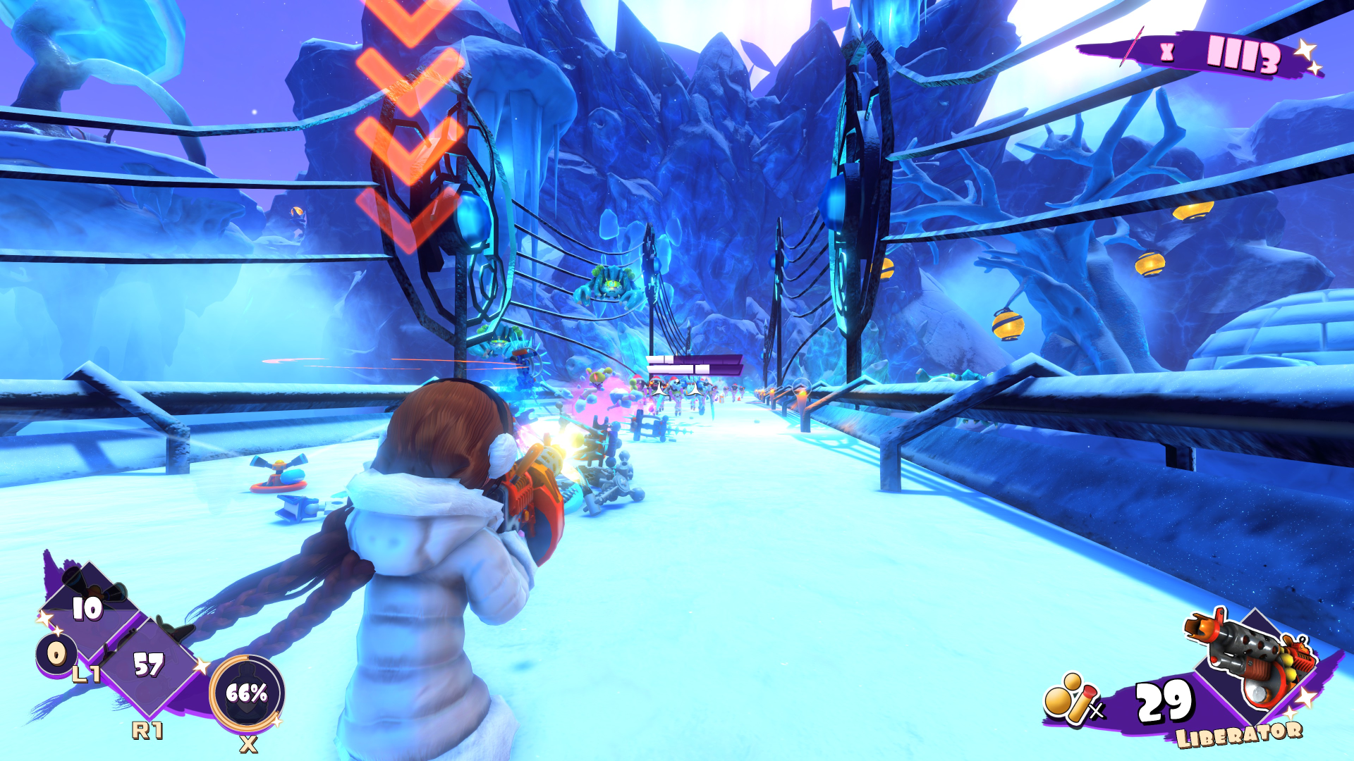 The combat starts out using standard weapons with a toy-like design but the number of weapons the game has is absolutely enormous. These enemies are as varied as a gun that fires homing orbs, a staff that summons rabbit-like figures to fight for you, and an electric gun that both causes stun damage and spreads to nearby enemies. There are four ammo types shared between the weapons, so it’s important to vary up your weapons so if you run out of one ammo type, you can still use other weapons.