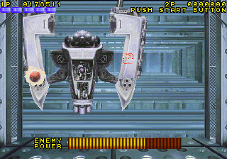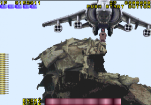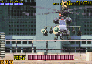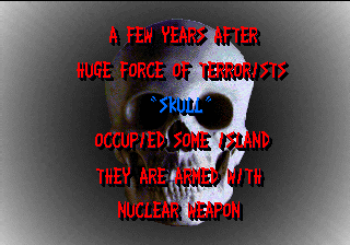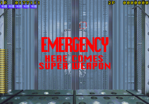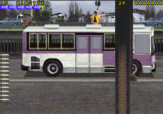 What it does have is cheese, and lots of it. Broken English is everywhere, with phrases “steal into the factory”, “pass a expressway” and “command to gun metal army”. The backstory amounts to a single sentence among the image of a skull, reading “A few years after huge force of terrorists ‘Skull’ occupied some island they are armed with nuclear weapon.” The digitized screams are amusing, with one in particular clearly being taken from the 1985 film Commando. The first few stages take place in a factory and then on a highway as you shoot down armored cars, tanks, and helicopters, venture through an urban wasteland, then infiltrate the nebulously named “Tower of Them” for the final encounters. The boss of this stage is a large missile-firing robots; destroy this and it will reveal a mechanical brain, complete with spinal cord, which continues to attack. In the final stage, you need to shoot down a nuclear missile, whittling down its health before the time limit expires and it hits its target. One might expect better missile defense systems than one or two special agents pounding it with hundreds of bullets, but perhaps that’s less thrilling.