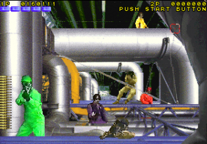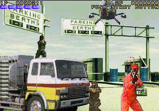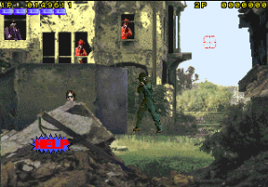 Operation Wolf 3 barely feels like an Operation Wolf game. Instead of taking place in a jungle, it takes place in an urban setting. The visuals are now all digitized live action images, similar to Konami’s Lethal Enforcers from two years prior. Commandos Roy Adams and Hardy Jones from the last two games are gone, replaced with the sleek and snazzy agents Hornet and Queen Bee. Rather than submachine guns, you wield large pistols, though they’re still cabinet mounted a la Operation Thunderbolt. There’s no need to worry about ammo supplies, because it’ll automatically refill when you stop firing.
