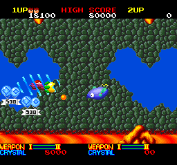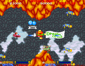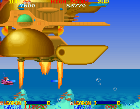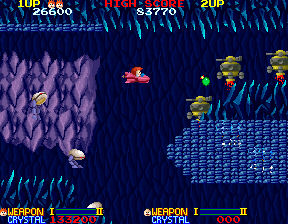 Ordyne owes a very heavy debt to Gradius. The pacing, the enemy formations, and in some cases the enemies themselves. Even the control scheme, which splits the offensive weapons between regular forward-firing weapons and low-angle firing bombs is the same. Where it differentiates itself is the power-up system, which is more closely influenced by Fantasy Zone. Destroyed enemies drop crystals, which are used to purchase weapons at shops found throughout each stage. Each shop has a set stock of three power-ups to choose from.