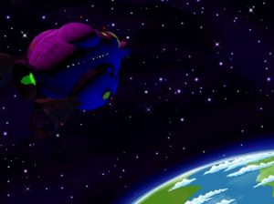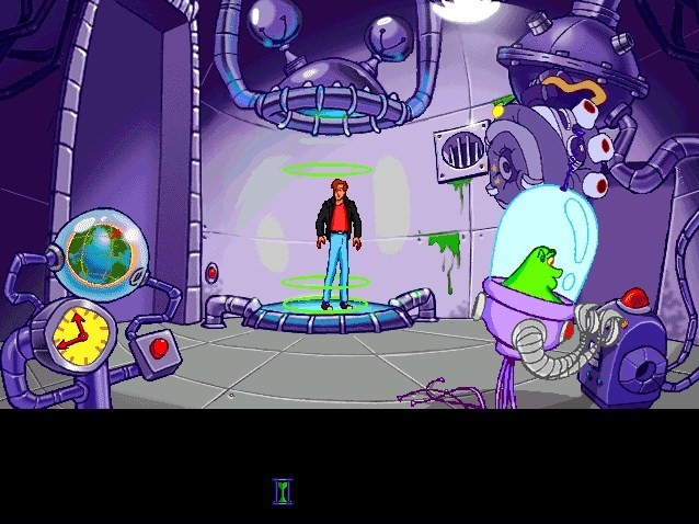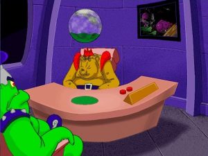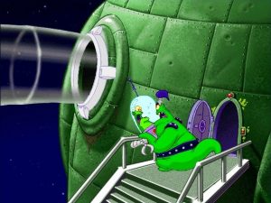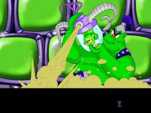 The game features two primary locations, one being Wilbur’s quaint home town. While it is definitely set in modern times, the idealistic small town – complete with a barefoot kid fishing off the old bridge with grasshoppers – feels right out of a fictional 1950s. The colorful characters and nostalgic presentation are reminiscent of the film The Iron Giant. You would hate for the rude waitress, the mayor with split personalities, or dear old Aunt Polly to be turned into hamburgers. The rest of the game is spent with the aliens, and it feels more like the animated Space Ace arcade game. There is even an alien love interest that looks like a cheesecake pinup girl. The main alien antagonist is of the evil obese variety, and while everything in the game is played for laughs, his callous attitude toward murder and even genocide is unsettling.