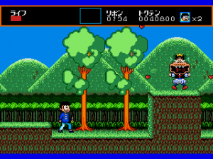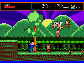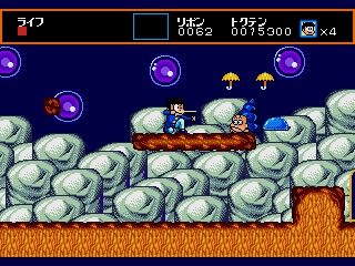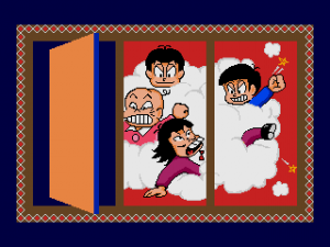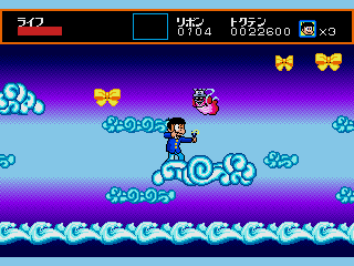 Sega had a thing for mazes in those days; side-scrollers like Spellcaster and The Revenge of Shinobi each featured an extensive maze level, while the dungeons in the first two Phantasy Stars were much more complex than those found in contemporaries like Dragon Quest II and Final Fantasy. Osomatsu-kun is all mazes. There are only three levels, but each of them is made up of several areas connected to each other through magical doors, cliffs, clouds and red balloons.