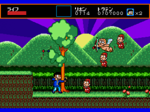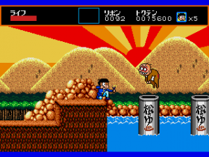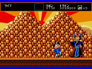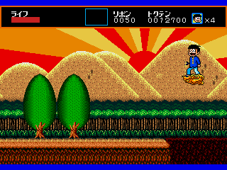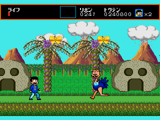 The visuals are striking, particularly the funky backgrounds, and so colorful that it looks more like a Turbografx-16 game. In the third level, which has a prehistoric theme, the cavemen enemies even have a dying pose that makes them look just like Bonk, though this game predates the character’s first game by about a year. The sprites do a good job of reproducing mangaka Fujio Akatsuka’s old-fashioned cartoon style, with Osomatsu’s facial expression even changing depending on how much health he has left, but they aren’t very large, and together with the animations, they give the game a bit of an 8-bit feel. Considering the year of its release, this isn’t much of a surprise.