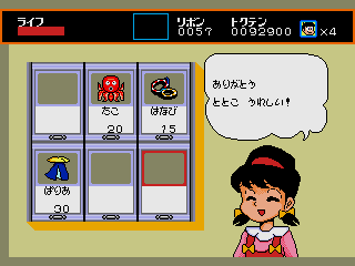 Totoko appears in a few spots as a shopkeeper, the currency in use being ribbons that you collect throughout the game. She sells various items that can then be accessed by pressing Start, such as wings that let you fly for a few seconds and a fish bone that summons a cat for you to ride, but none of them are especially useful. You can also spend your ribbons in a slot machine where you can win extra lives, or a mini-game where you pick a path through a small top-down maze to get Osomatsu to a treasure chest.