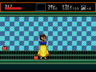 Your first objective is to find and defeat the local mid-boss, after which a new path opens up that takes you to the true stage boss. Both regular enemies and mid-bosses are usually variations of Iyami, Chibata, Dekapan, or other cast members, repurposed as man/animal hybrids and bizarre creatures, while the three major boss battles have Iyami throwing projectiles in simple patterns under some goofy disguise. In the second level, he’s dressed as Snow White.