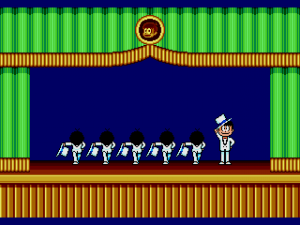 Hachamecha Gekijo is somewhat infamous in its native land. The Mega Drive launched at the end of October 1988 with just two games: Space Harrier II and Super Thunder Blade. Altered Beast followed a month later. The first two were sequels to arcade hits, while the third was a port; Osomatsu-kun was to be the first all-original, console-style game for the system, just in time for the Holiday season. Previews promised an attractive platformer on a (then impressive) 4 megabits cartridge, with up to 8 stages, each with its own distinct setting. Towards the end of development, however, Sega’s management decided to cut the cartridge size by half, possibly due to a worldwide chip shortage then affecting the market, and eight stages became three.