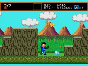 Osomatsu’s slingshot has a short range in the beginning, but it increases after each level, so that it becomes more efficient as enemies become more numerous. It can also counter most incoming projectiles, making the game pretty easy. He jumps as if on the moon, which has the advantage of making it easy to control where you land since you get plenty of time to adjust in mid-air.