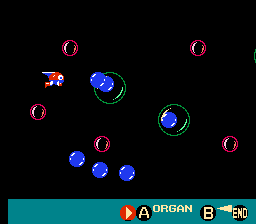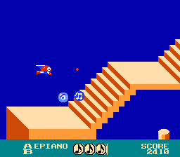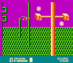 At its core, Otocky respects a classic shoot-em-up scheme composed of side scrolling levels and boss stages. The main objective lies in the recollection of musical notes, scattered around the stages either freely or cleverly concealed in item boxes. Gathering enough of these notes will enable the player to visit the level bosses, consisting of gigantic music notation symbols. Otherwise, until this gauge is replenished, the level will continue to repeat itself perpetually. However, unlike a common shooter, the mechanized avatar will only shoot projectiles as part of a distress attack, assigned to the B button. The main action of the character consists of throwing spheres by pressing the A button together with one of the eight D-Pad directions. These random red and blue spheres, used for picking up items and defeating enemies, can only travel a short distance and will always return to their sender.