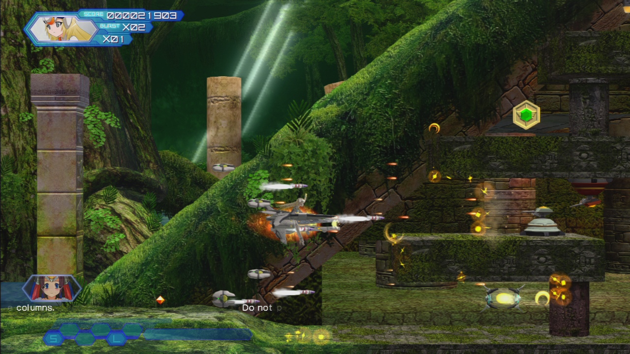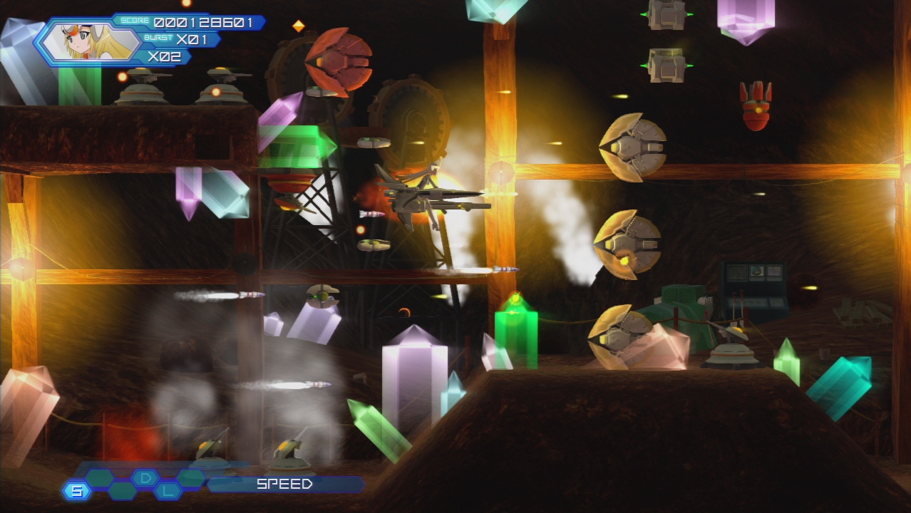 There are a total of eight levels, though the final one can only be reached by successfully killing the seventh level boss before it times out. All of the elemental, RPG and scoring systems have been gutted or simplified. Enemies still drop colored gems, but they only slightly increase your score. The Burst system has changed up a bit too. Rather than a meter, you simply have stocks like bombs. The Quick Bursts will hit everything on the screen and consume one stock. However, you can execute a Platonic Break by holding down the button for several seconds, which will unleash a character specific special attack. These are rather handy, seeing as they don’t consume any Burst stocks and the penalty to suffer from using them is a slight cooldown period. Unfortunately, enemies killed with the Bursts no longer drop power-up capsules, nor is there the ability to replenish them with the power bar. Instead, Bursts are only restored upon dying or finding a rare icon, so it’s not conducive to scoring anymore. Characters still level up after completing a game, but for the most part, other than gaining ranks and unlocking Achievements, these don’t actually do much. The only character it affects is Hyper Anoa, an unlockable super version of Anoa which has a massive power bar, who gains new weapons as she ascends through the ranks.