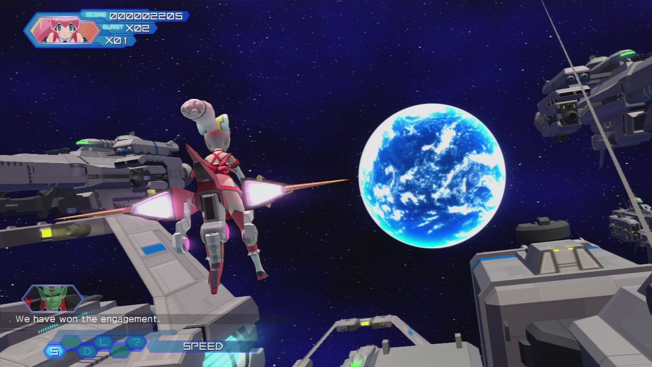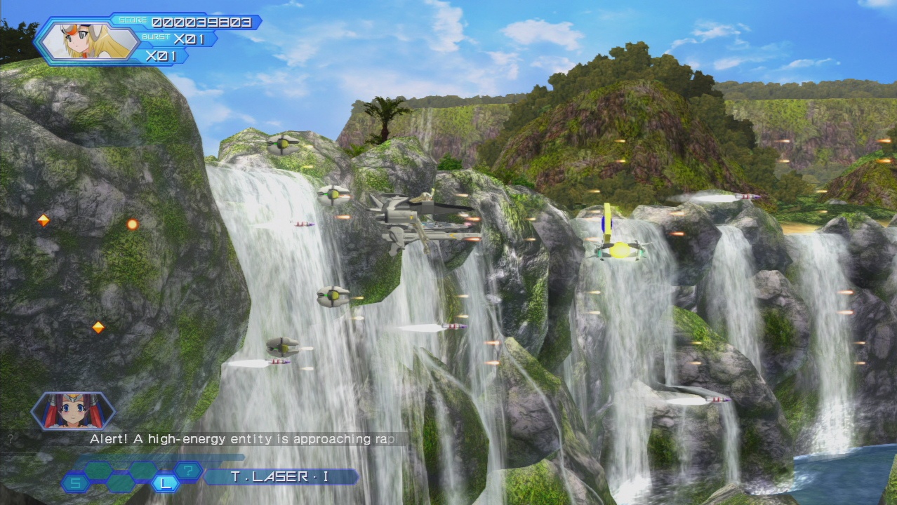 From the moment Otomedius Excellent boots up, it’s evident that Konami had a bit more faith in this project, enough to give it more of a budget. The crappy intro from the first game was given way for a full animated movie, complete with a peppier vocal song. The graphics, while still not exactly high class, are a substantial improvement nonetheless, with subtly cel-shaded player characters and improved background effects. The portraits of both the girls doing their special attacks and the bosses taunting you are now animated, usually with a fair bit of bounce.