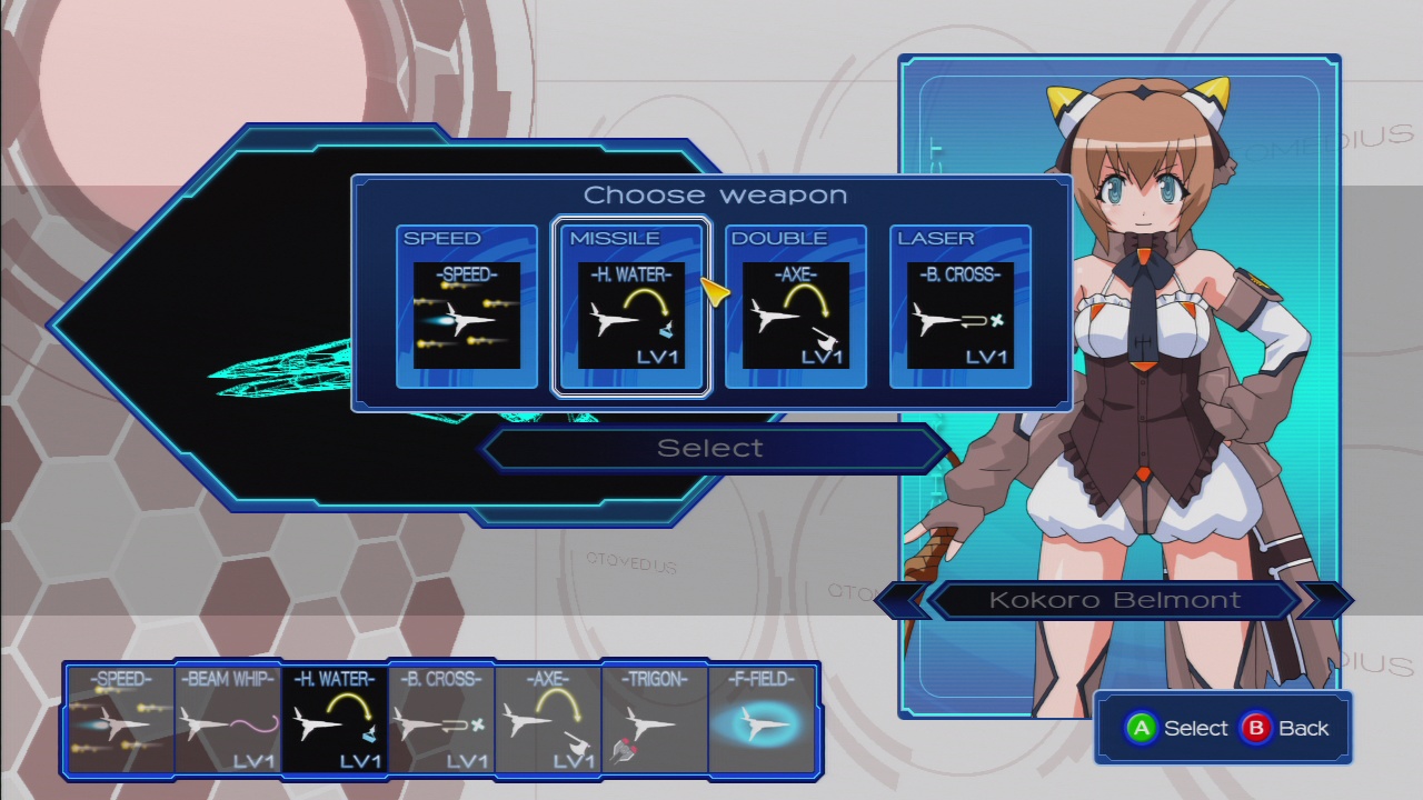 Kokoro Belmont is inspired by the Castlevania series. Her primary weapons are the Laser Whip, Holy Water as bombs, and axes and cross boomerangs as other weapons. Her ship, the Stavros, is taken from Trigon / Lightning Fighters, which had also guess starred in the boss rush of Gradius Gaiden. Her Platonic Burst attack is the cross shaped laser, the other super attack from that game, and her option is named the Trigon, which powers up its weapon rather than replicating. Unfortunately she is only available as DLC.