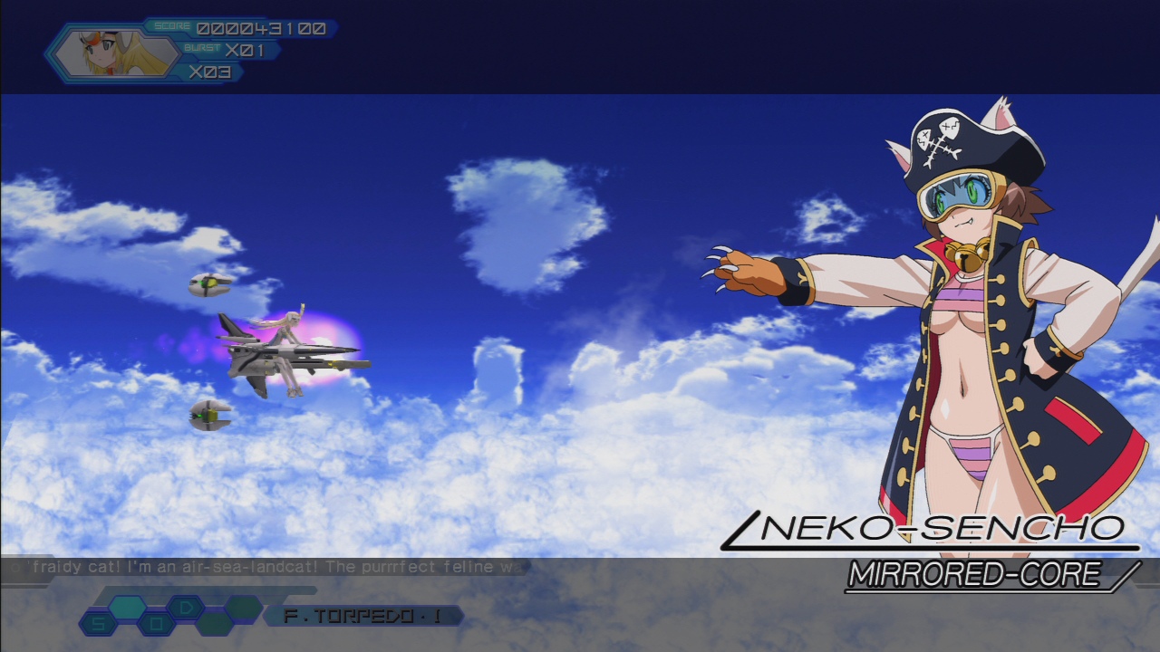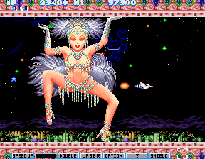 The cat pirate ship from Parodius Da! (and reappearing a few other times in the series) has been turned into a bikini-clad girl, and commands the Mirrored Core, the first level boss.