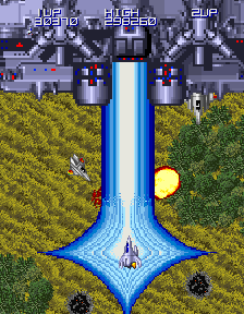 Gesshi Hanafuuma hails from the Konami Famicom game Getsu Fuuma Den. Her options are replaced by a “Hadouken” power (translated as “Wave Sword”), which is at the first spot on her power-bar to be easily equipped or powered up, and are multi-directional wave attacks. The rest of the weapons and the design of her ship are borrowed from the SNES shooter Axelay, with the exception of her Platonic Burst, which summons a fire dragon a la the ship from Trigon / Lightning Fighters.