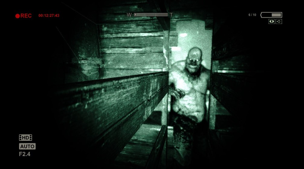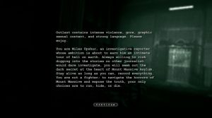 Outlast opens with investigative journalist Miles Upshur (presumably without a paddle) making a tense drive to Mount Massive Asylum. He’s received an anonymous tip from a whistleblower who worked for two weeks as a software engineer at Mount Massive, and was horrified by what he saw. “Terrible things happening there. Don’t understand it… People are being hurt and Murkoff is making money. It needs to be exposed.” And so, armed with nothing but his trusty camcorder – which has a night-vision mode, at least – and a handful of batteries, Miles sneaks into the asylum in an attempt to uncover the truth.