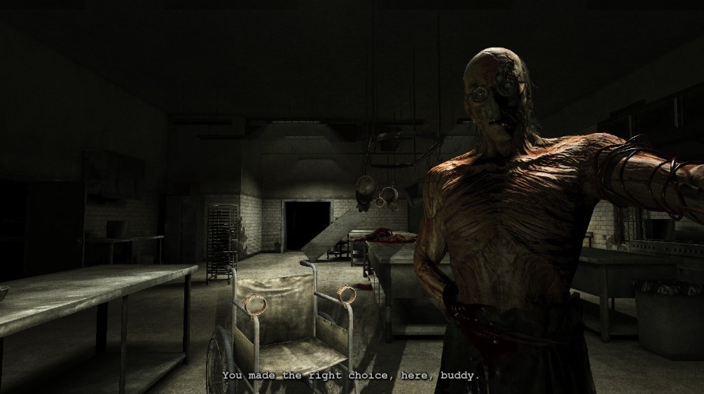 To its credit, the plot of Outlast contains a detailed justification of exactly why so many of the patients you encounter are so… stabby, and it extremely explicitly lays out that the unfortunate patients of Mount Massive Asylum were specifically chosen because people are less likely to ask questions about the wellbeing of the certifiably insane. This point is hammered in excellently in a speech from a variant known as ‘The Pyro’, who Miles encounters in the blazing cafeteria, patiently waiting to burn to death. “Murkoff took so much from us. Used us. Turned us into these things, because nobody cares about a few forgotten lunatics.” A surprisingly poignant message from a game that two chapters prior, tried to jump-scare the player with the scene of a patient trying to have his way with a headless corpse.