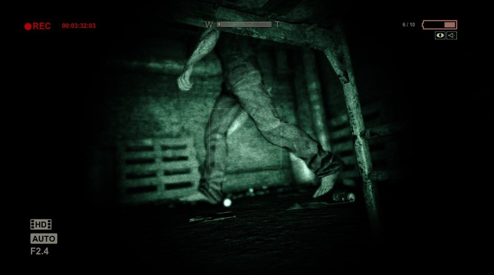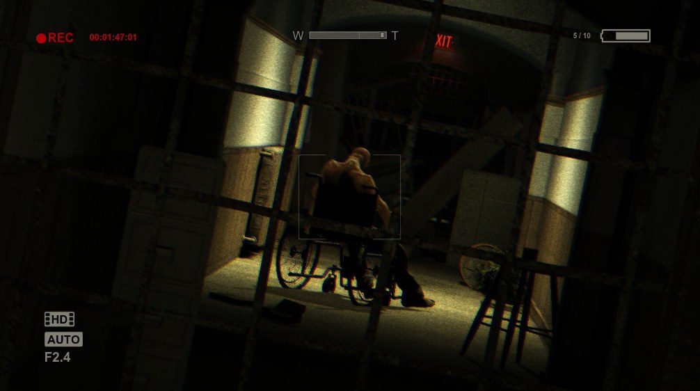 So, on top of dealing with the many people actively trying to murder you, Outlast also throws the tiniest bit of resource-management at you, just to make sure you’re not getting too comfortable at any time. The decision of leaving an area that you’ve designated as safe in order to do a quick check for batteries – or just pausing in the middle of a chase because you think you saw something glinting on your camcorder, and an extra battery might be worth the hit you’ll take from the pursuing variant – is always a difficult one, although batteries aren’t the only reason that you might be tempted to explore, as Miles can also find documents and record events that he will transcribe into notes that range from terrified to sarcastic to cautiously curious.