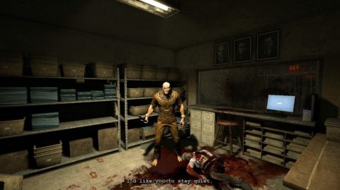 A slower-paced game might take the time to gradually increase the uneasiness of the player by dropping a few sparse hints that something is amiss, letting their imagination run wild until a dramatic reveal. Outlast is not this game, and within three minutes of entering the asylum, Miles has already discovered a library full of freshly-killed staff members and decapitated heads, one of Murkoff’s private military contractors who has been impaled upright on an iron pole and remains alive just long enough to tell Miles that the patients have all escaped, and he needs to “get the f*** out of this terrible place” before dying, and met a hulking ogre-like man who calls him “little pig” before throwing him through a first-floor window and down to ground-floor reception. Having definitively confirmed using his sharp journalistic insight that something is, in fact, wrong, Miles’ primary goal quickly changes from uncovering the asylum’s secrets to getting the hell out of there; an objective which he finds repeatedly thwarted by fate, bad luck, and the patients themselves, referred to a ‘Variants’.