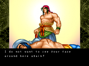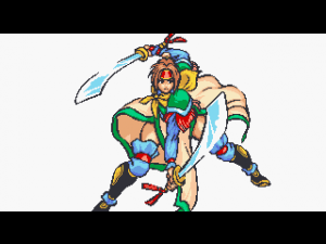 The main character, more or less. He wears a bandanda like the hero of the first Suikoden game, and has a dragon tattoo on his back. Wields a sword.