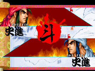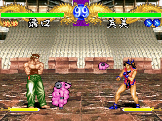 Also, Chao Gai, the last boss, is now playable in single-player mode, and there are two guest characters: Makoto Mizoguchi makes his return from the PS1 port, and Yungmie from Fighter’s History Dynamite has also been added. Although they’re technically completely out of place next to the Water Margin characters, their designs are pretty similar, so they don’t stand out too much, and they’re actually reasonably fun to play as. Mizoguchi also has a desperation move which summons the pink sheep from Trio the Punch, as a cool reference to another Data East title.