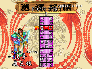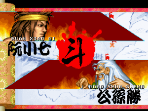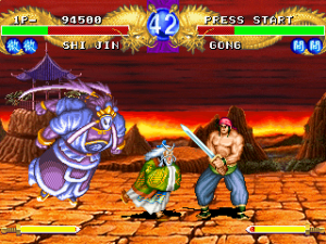Suiko Enbu Fuunsaiki is a Saturn-exclusive upgrade of the original game – in other words, it’s an apology for the abomination of the original Saturn port. The enhanced gameplay engine from the American version is used here, and once again, there are still issues with slowdown. To help mask some of these issues, however, Data East sped up the gameplay a lot. There are three speeds, with “Slow” being about the same speed as the original game, “Normal” being much faster, and “Fast” going completely haywire. This increased pacing actually works wonders for the fighting, and it feels much smoother as a result.