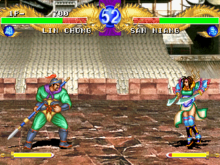 That’s not to say it’s an entirely original concept – Outlaws of the Lost Dynasty is basically Street Fighter II crossed with Samurai Shodown. It utilizes a Capcom-style six button layout, you can run by double tapping the joystick, and the views zoom in and out. Most of the characters are equipped with weapons – swords, spears, etc. – but this is where Outlaws of the Lost Dynasty strays from the norm. Your weapon’s durability also acts as sort of a guard crush meter – if you block too many special attacks, it’ll break, and in addition to being dizzied, you’ll lose it for the rest of the fight. Compared to Samurai Shodown, though, where characters are pretty much useless without a blade, there’s actually a huge advantage to unarmed combat. Although weapons are more powerful, your attacks are much quicker when you rely on your fists, and it’s much easier to perform combos. If you’re more into this style of gameplay, you can toss your weapon at your foe at any time – which will also dizzy them, if it connects – and then fight completely hand-to-hand.