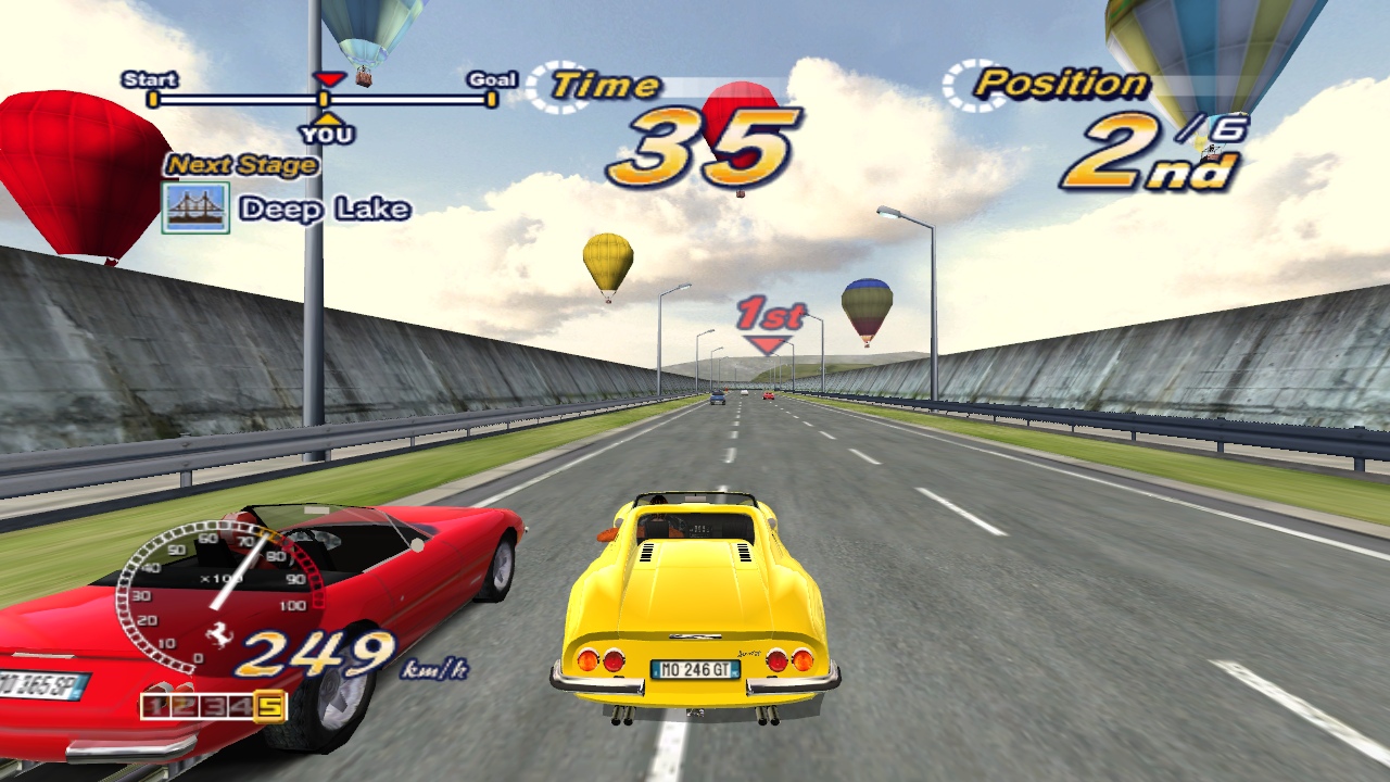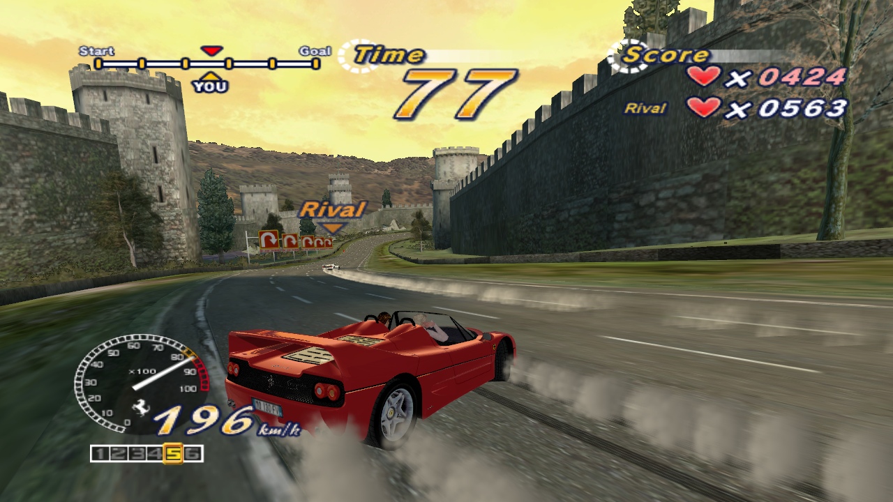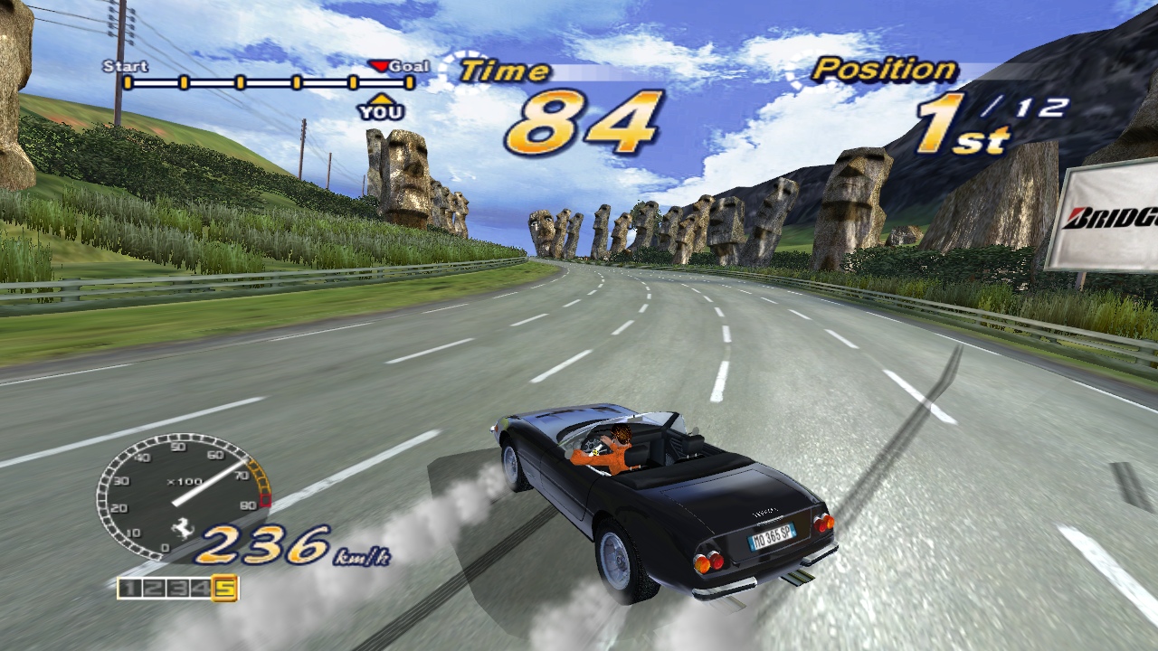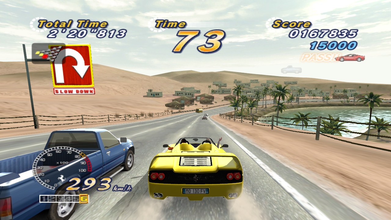 Breathtaking stages, a silky smooth 3D engine, and the stars of the game: the shiny, expensive Ferraris. Each of the real-world locations look stunning, as you drive past the Eiffel Tower at night, speed along the pyramids of Egypt, blaze through the flower gardens of Holland, and along the classic beachfront just like the original title. It’s also the only game to make a rundown industrial complex look gorgeous. The five different goofy endings make an appearance too, depending on which course you take, just like old times. There are three different girls to sit next to you, depending on which mode you’re playing.
