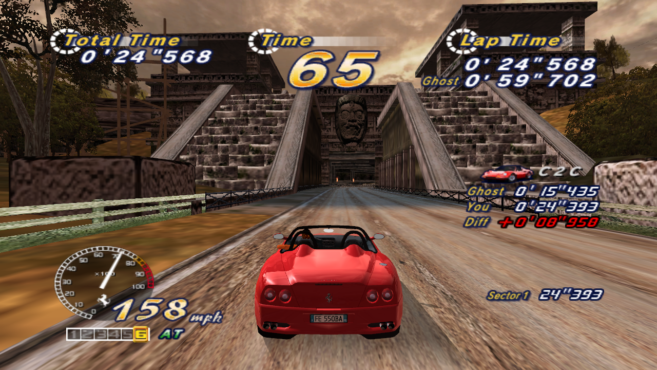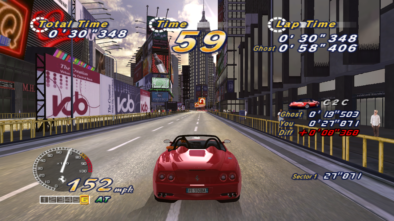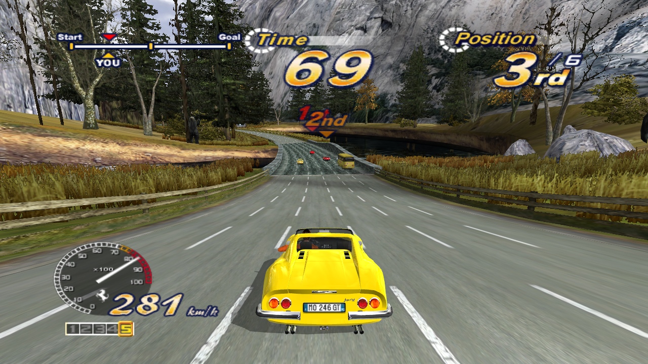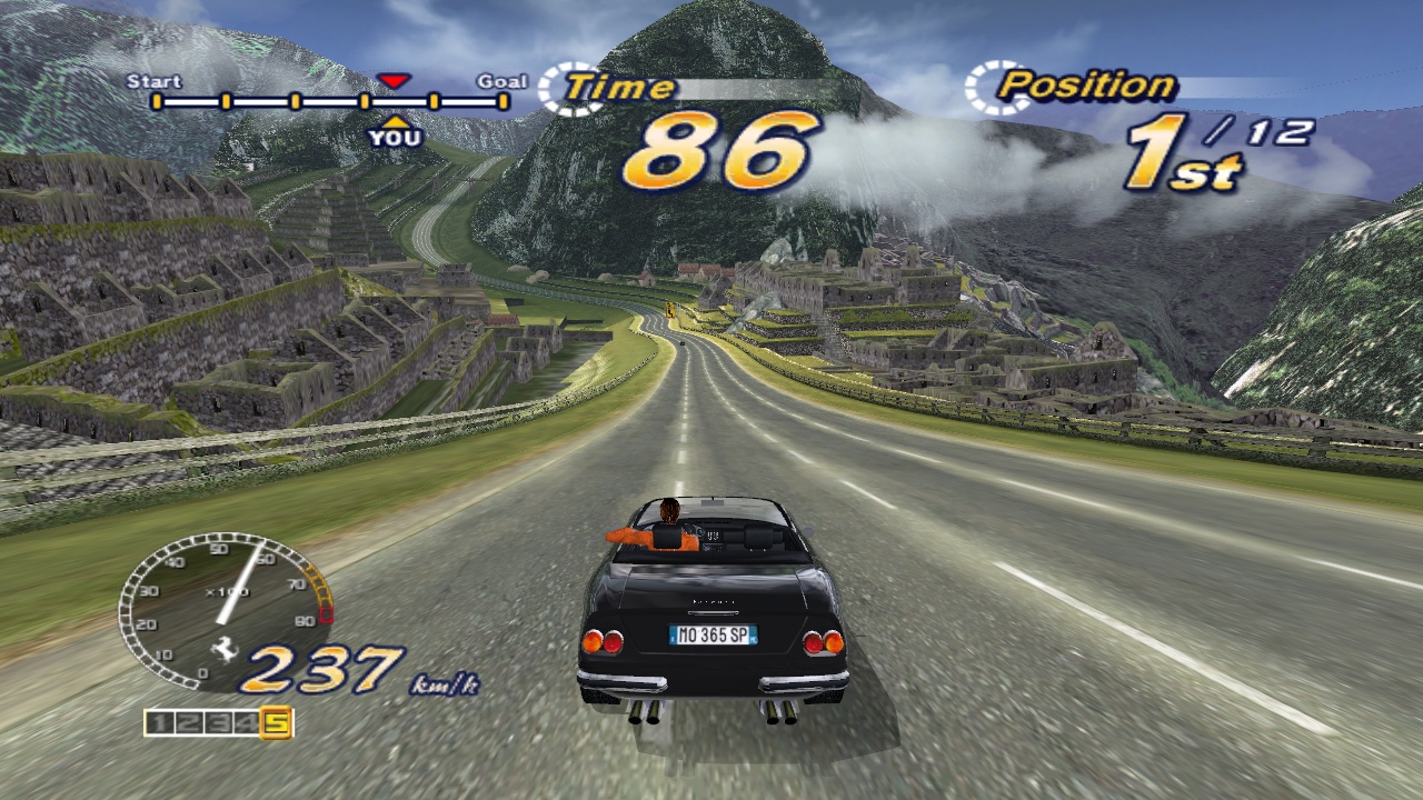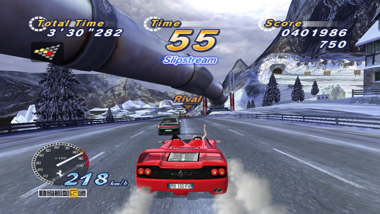 Breathtaking stages, a silky smooth 3D engine, and the stars of the game: the shiny, expensive Ferraris. Each of the real-world locations look stunning, as you drive past the Eiffel Tower at night, speed along the pyramids of Egypt, blaze through the flower gardens of Holland, and along the classic beachfront just like the original title. It’s also the only game to make a rundown industrial complex look gorgeous. The five different goofy endings make an appearance too, depending on which course you take, just like old times. There are three different girls to sit next to you, depending on which mode you’re playing.