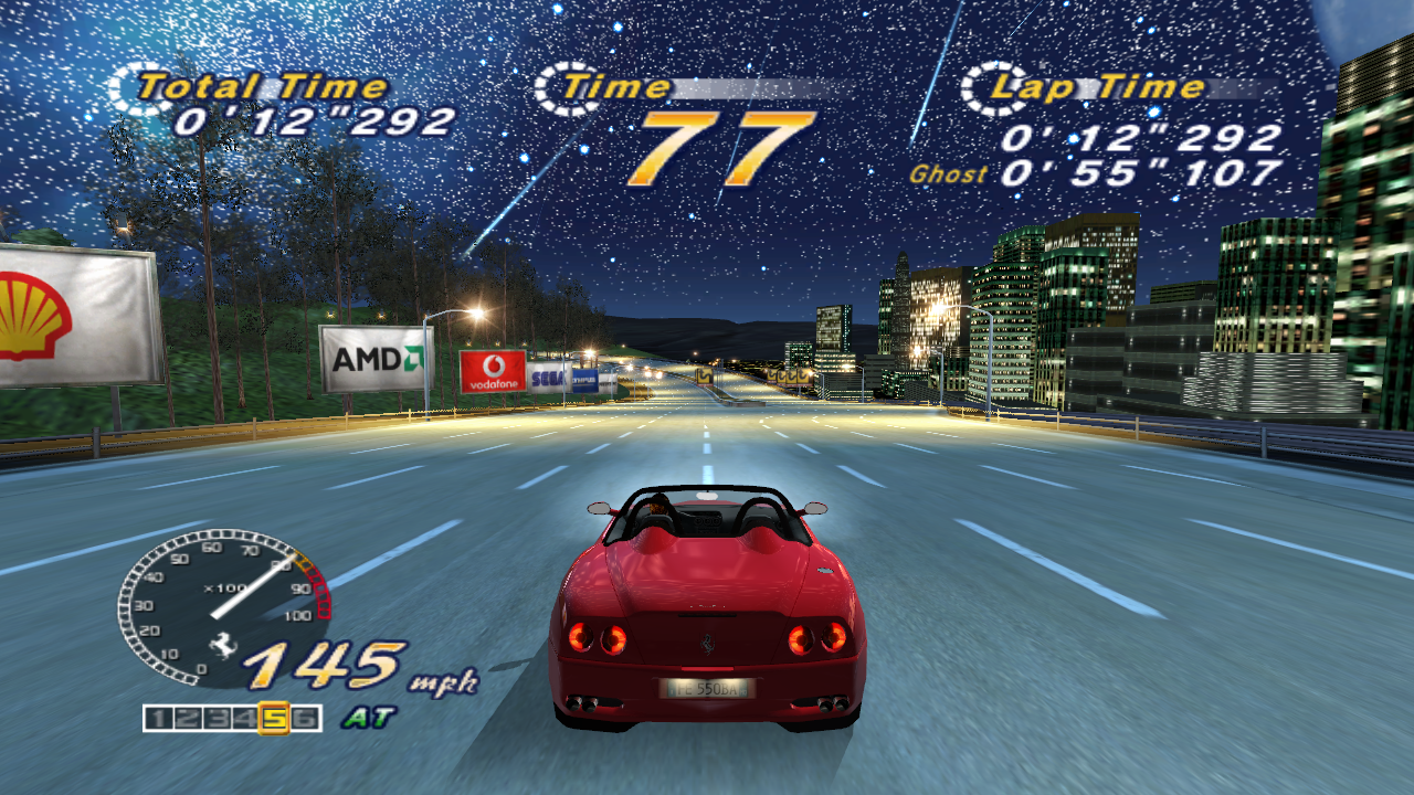 In 2004, Sega released a new version called OutRun SP. However, calling it a mere “upgrade“ isn’t doing the game any justice. This new entry includes 15 totally new stages, tweaked physics, and more tunes, which is way more than your average upgrade. In the new levels you’ll drive across the Golden Gate bridge, through gigantic sequoia trees, past an arctic oil refinery, see the Moai heads of Easter Island, zoom through a Las Vegas-style city, and under a starry night sky next to a space shuttle launch.