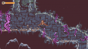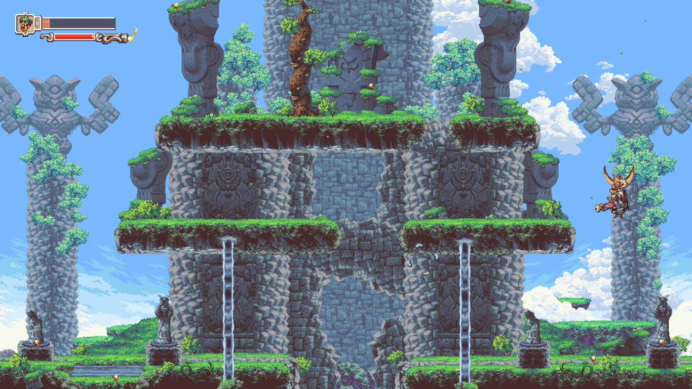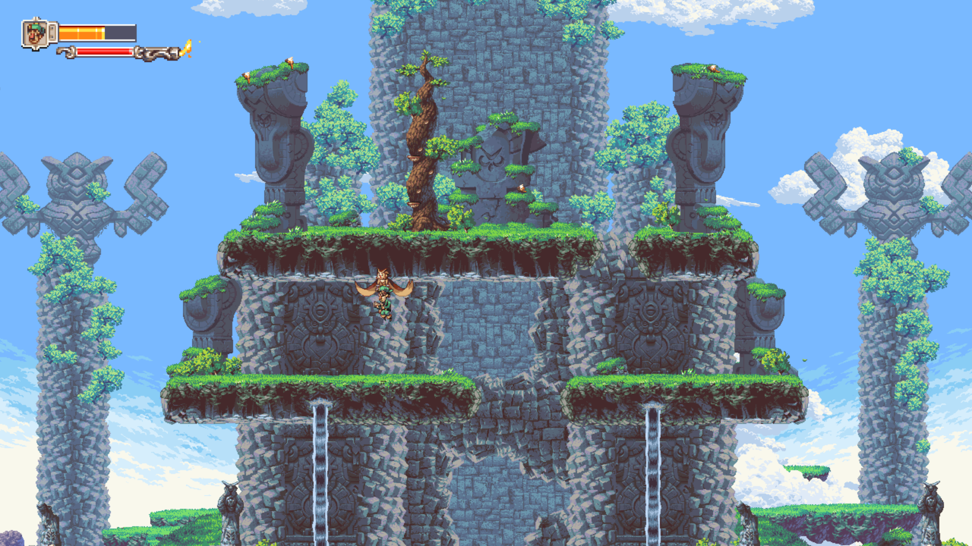 Owlboy is sort of a micro-version of its contemporaries. It gives a solid ten or more hours, but it manages to avoid padding, never outliving its welcome. The game’s central mechanics are also surprisingly innovative. Otus is a character barely able to fight by himself, only given a spin move that stops enemies momentarily. For combat, he gets three different gunner friends as the game goes on, each with their own abilities that help with both combat and traversing terrain. Otus’ role is flying his friends around.