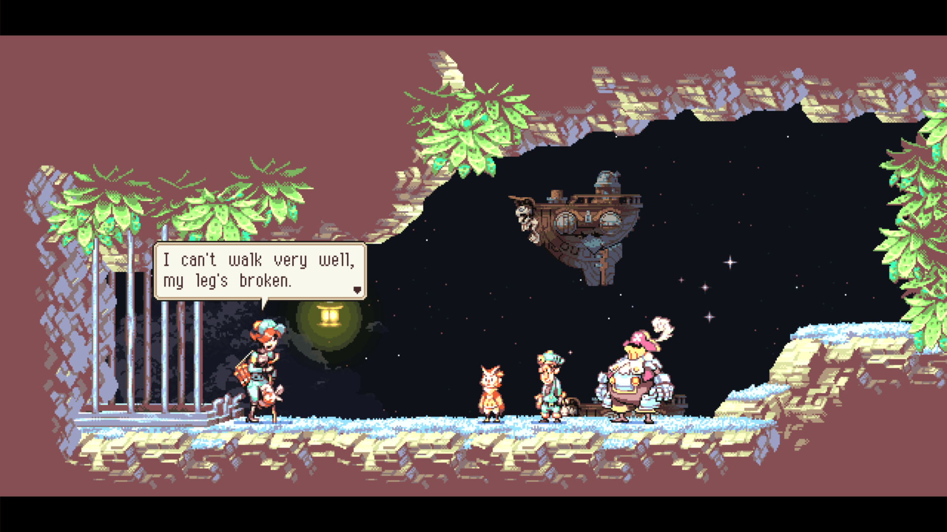 Owlboy is overall a solid but not a particularly memorable game with only these merits taken into account, but its story is where it goes from good to great. See, Owlboy‘s big trick here is that Otus isn’t a player avatar that remains silent for the sake of roleplaying. He is his own character with his own motivations, goals, wants and needs, mostly expressed through his lively expressions. He doesn’t really work like Link, Samus, or the Belmonts do either, because he never gets stronger himself, only his friends get stronger. He’s not silent for self-insertion or a power fantasy, he’s silent because he can’t speak.